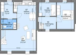 3 værelses på 72 m