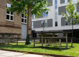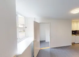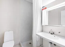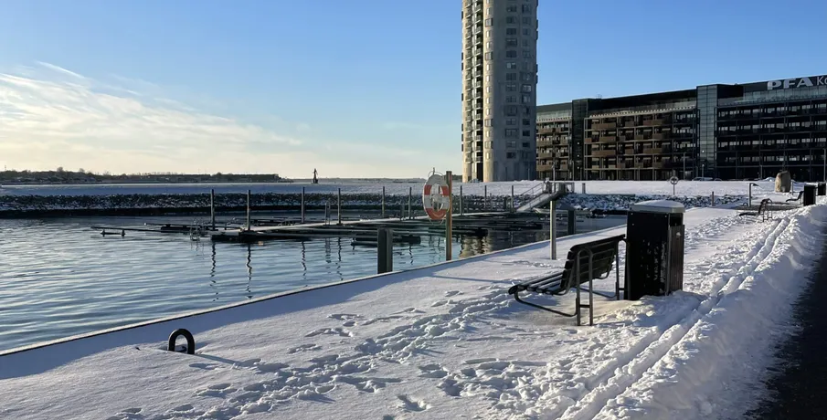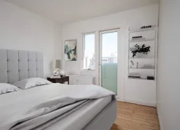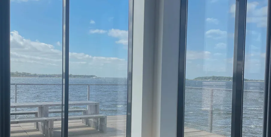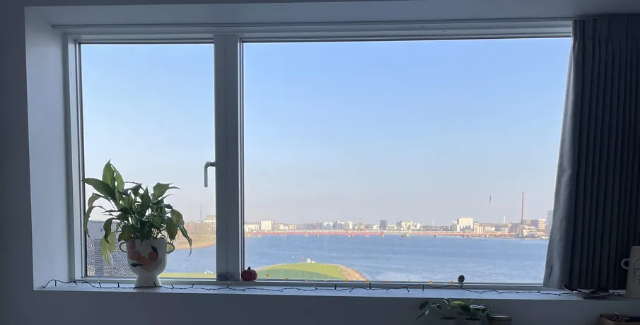 værelse med smuk udsigt til limfjorden på PFA kollegiet, nørresundby. værelset har egen toilet og bad, der er en stor køkken lige uden for værelset, som man deler med andre studerende. fælles vaskerum. gratis fitnessrum og musikrum.