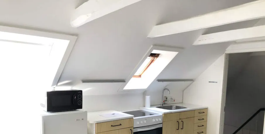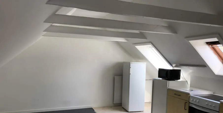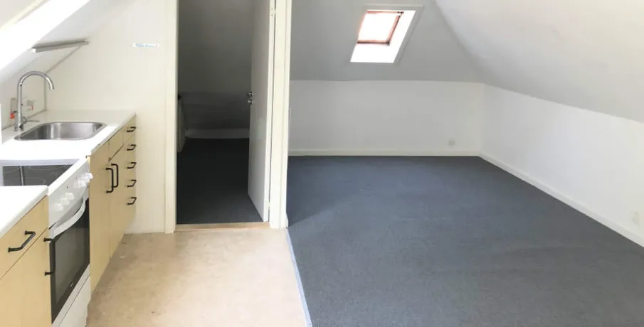 Værelset er på ca. 20 kvm med thekøkken og eget badeværelse i kælderen.