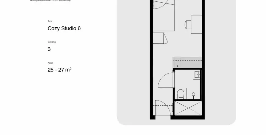 . Om Studio 22. Studio 22 er et moderne bofællesskab skabt til studerende og young professionals under 35 år.. Her får du både privatliv og fællesskab – med madklubber, kreative værksteder, studieområder og hyggelige lounges.. Du kan reparere din cykel, lave kreative projekter, deltage i sociale events – eller bare slappe af i din egen bolig.. Din bolig indeholder. - Fuldt møbleret: skrivebord, lampe, stol, gardiner, garderobeskab og opbevaring. - Eget badeværelse med bruser, håndvask og toilet. - Lille tekøkken med kogeplade, emhætte, vask og køleskab. - Indflytningsklar fra kun 6.500 kr./mdr.. - Mulighed for boligstøtte på alle boligtyper. Fællesområder & faciliteter. - Fitnesscenter. - Kreative værksteder. - Privat biograf. - Loungeområder & fælleskøkkener. - Sociale arrangementer og events. Alt sammen inkluderet i huslejen.. Beliggenhed. Kun 13 minutter til Nørreport St. – tæt på både byliv, studie og arbejde.. Lejebetingelser. - Studerende: Bygning 1, 2 eller 3. - Young Professionals: Bygning 3. - Aldersgrænse: Under 35 år. - Dokumentation for arbejde skal kunne fremvises. - 2-personers boliger: kun type 5, 8, 9 og 10. - Minimum lejeperiode: 12 måneder. - Depositum: 15.000 kr. (betales ved kontraktindgåelse). Få den fulde boligliste hos mægler for overblik over bygninger og værelsestyper..