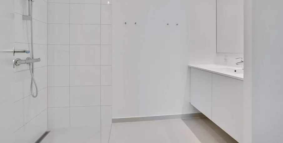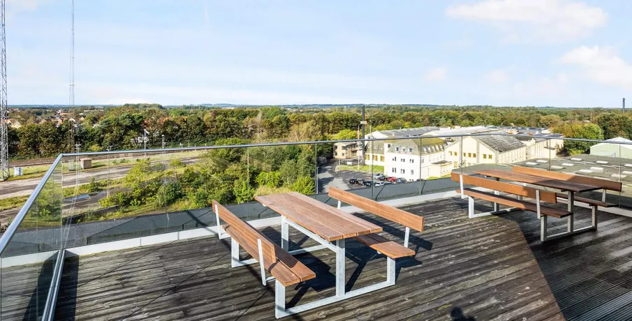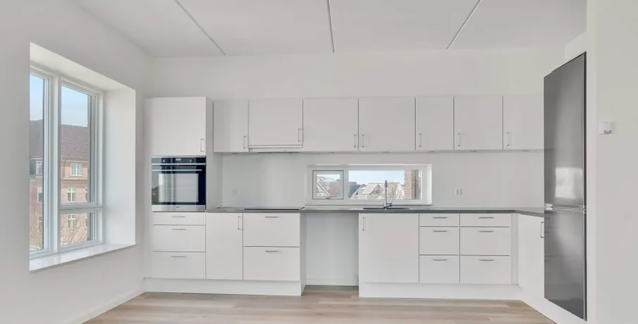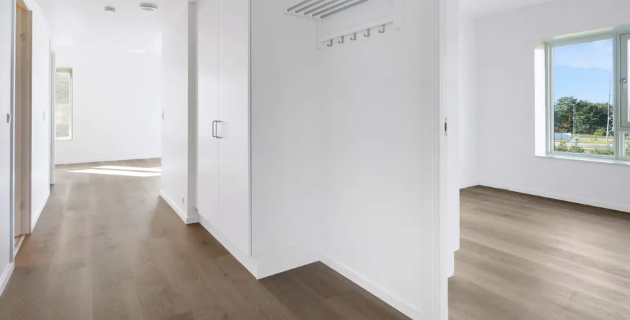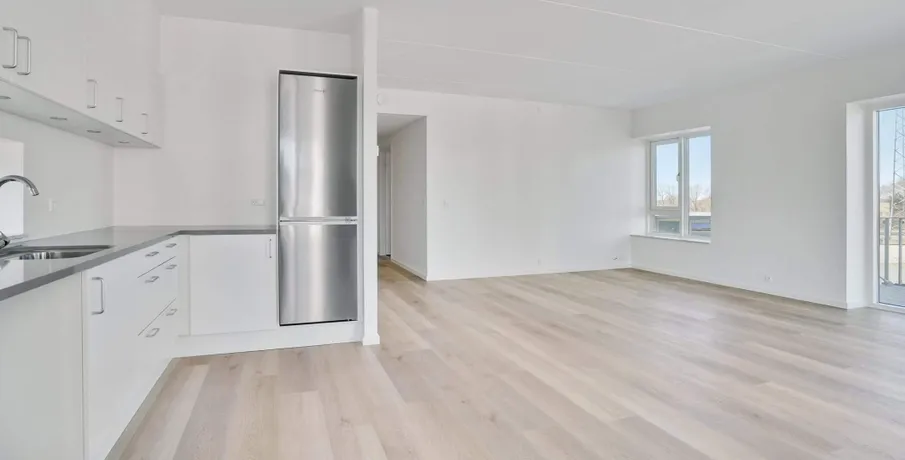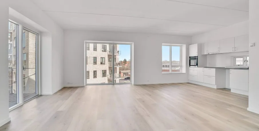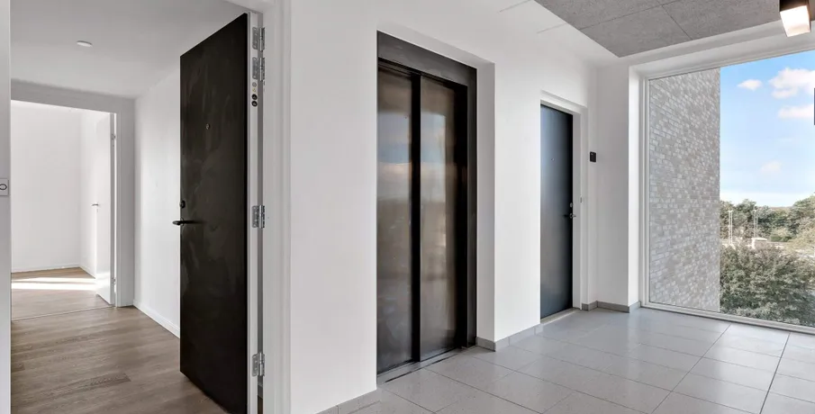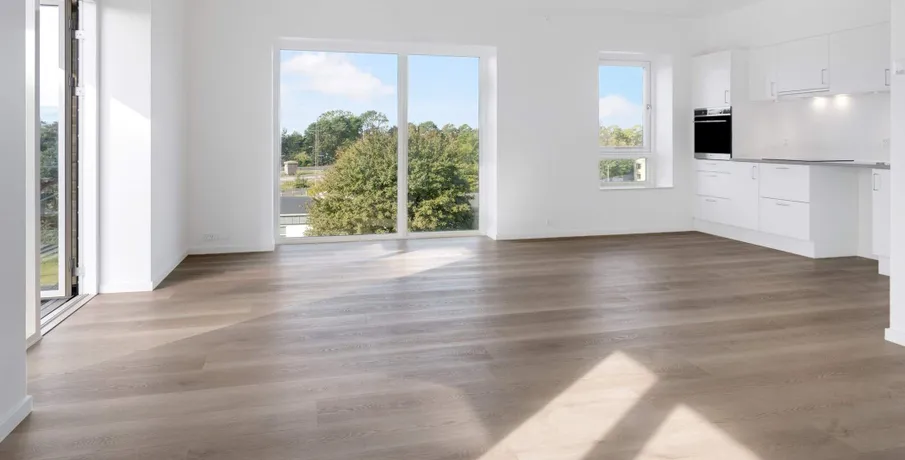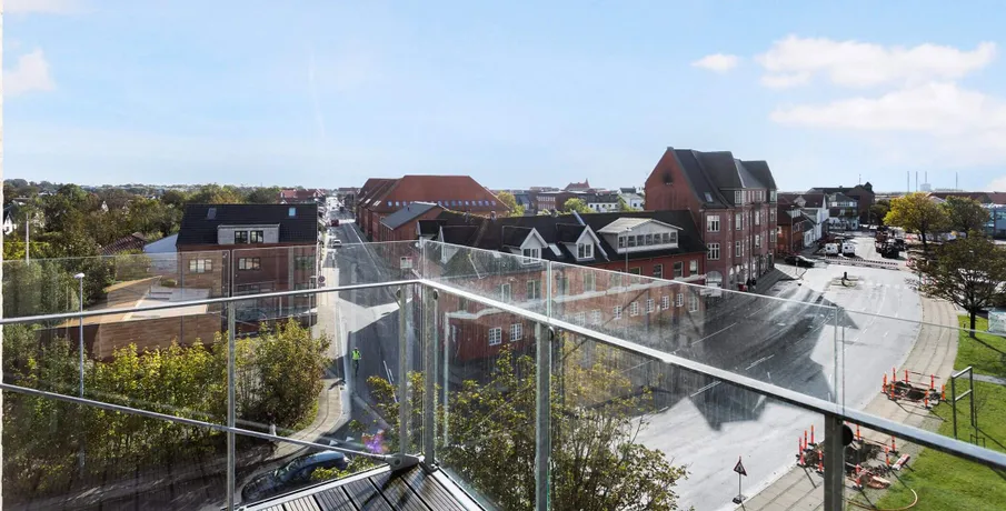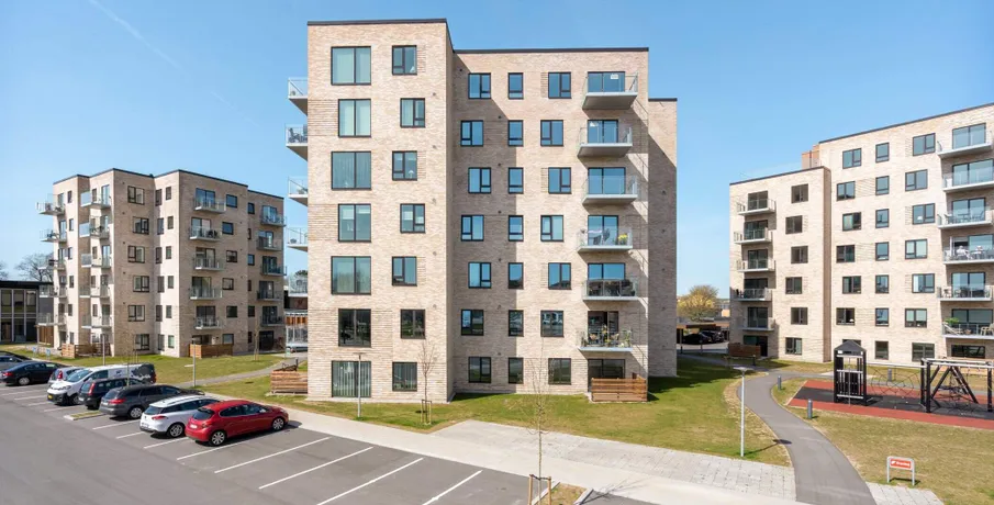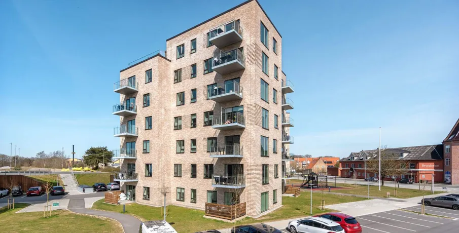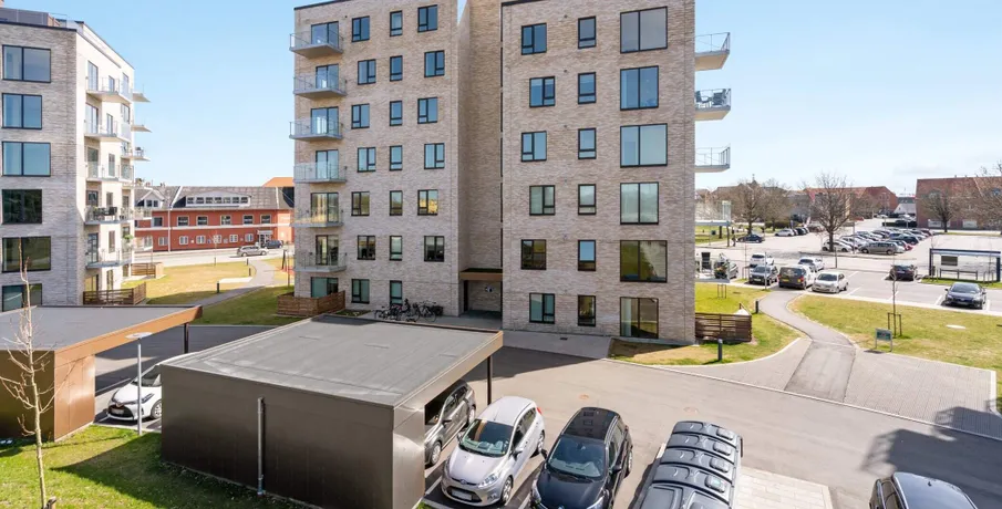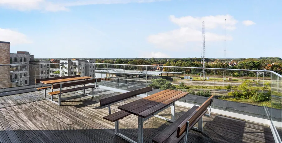 Lys og lækker 2-værelses lejlighed, bygget i de mest kvalitetsbevidste materialer, naturligvis med gulvvarme, vinylgulv i træstave, inventar fra Invita, et generelt vedligeholdelsesfrit lejemål.. Dejlig stor entre med indbyggede dobbeltskabe. Herfra adgang til badeværelse og med plads vaskesøjle, indbygget badeværelsesarrangement med vedligeholdelsesfri stenplade, bruseadskillelse i glas, og flot flisegulv.. Samtalekøkkenet med spiseplads ,med flot stenbordplade, og indbygget køle/frys. Større vinduesparti fra gulv til loft gennemlyser rummet til den fantastiske udsigt udover Brønderslev.. Opholdstuen er placeret med møbleringsvæg mod adgangssiden og et gennemgangsforløb mod boligens private lækre terrasse, med gulv af hårdtræ og glasafskærmning.. Stort værelse med indbygget skabe.. Lejemålet er naturligvis opført efter gældende energikrav, og er derfor med separeret ventilationsanlæg. Anlægget sørger for balanceret ventilation med høj varmegenvinding, således kan opnå en besparelse på varmeregningen.. En fælles tagterrasse med en fantastisk udsigt, er tilgængelig i lejemålet.. Bemærk: Der er reduceret husleje de første 6 mdr - efter 6 mdr. stiger huslejen til 8.573 kr. + forbrug.