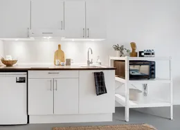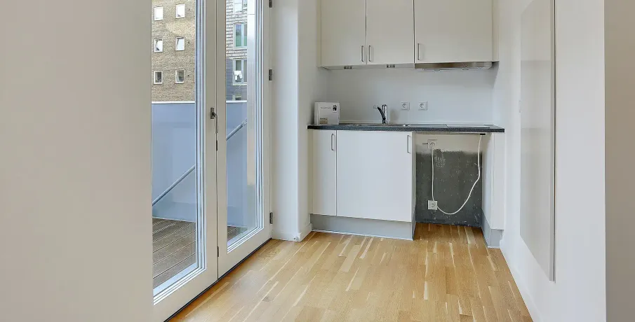 . På Lærkevej i København NV udlejer vi 1-værelses lejligheder for alle, der gerne vil bo småt, men godt. Boligerne har en sin egen altan eller en fransk altan. Alle boligerne har køkkenniche og badeværelse med egen bruseniche.. Hårde hvidevarer. Du får køleskab og fryser i alle boligerne. Der er fælles vaskefaciliteter i ejendommens kælder.. Husdyr. Det er ikke tilladt at holde husdyr.. Parkering. Du kan leje parkeringsplads i en aflåst gård.. Fælles arealer. På hver etage er der et fællesrum med køkken og opholdsstue. Her har du mulighed for at invitere gæster på besøg, hvis lejligheden bliver for trang.. Læs mere om boligen. De viste billeder kan være fra et andet men tilsvarende lejemål i samme ejendom. Mindre afvigelser kan derfor forekomme..