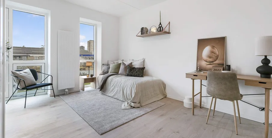 1-værelses lejlighed – Poppelstykket. Boligen. Velkommen til Poppelstykket i København SV, et moderne boligområde med funktionelle og lyse lejligheder.. Den 1-værelses lejlighed er praktisk indrettet med god pladsudnyttelse og mulighed for både sove- og opholdsplads i ét.. Ejendommen. Ejendommen tilbyder fælles køkkener, opholdsrum og vaskemuligheder, som gør hverdagen nem og bekvem. Her får du et moderne hjem med alt det nødvendige inden for rækkevidde.. Området. Poppelstykket ligger i et attraktivt område tæt på Valby Station, som giver nem adgang til resten af København.. I nærområdet finder du dagligvarebutikker, caféer, fitnesscentre og grønne områder, der gør hverdagen både nem og behagelig.. Billederne i denne annonce kan være fra lignende enheder og er kun til illustration. De repræsenterer stilen og kvaliteten af de tilgængelige enheder og kan variere i opbygning og detaljer.. Møblerne vist på billederne medfølger ikke. De skal give et indtryk af, hvordan rummet kan indrettes, men er ikke inkluderet i lejemålet..