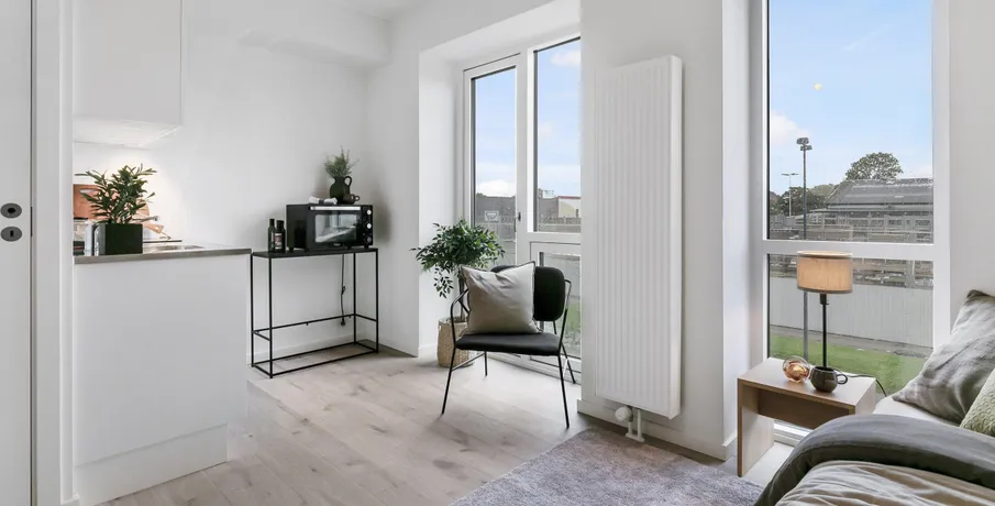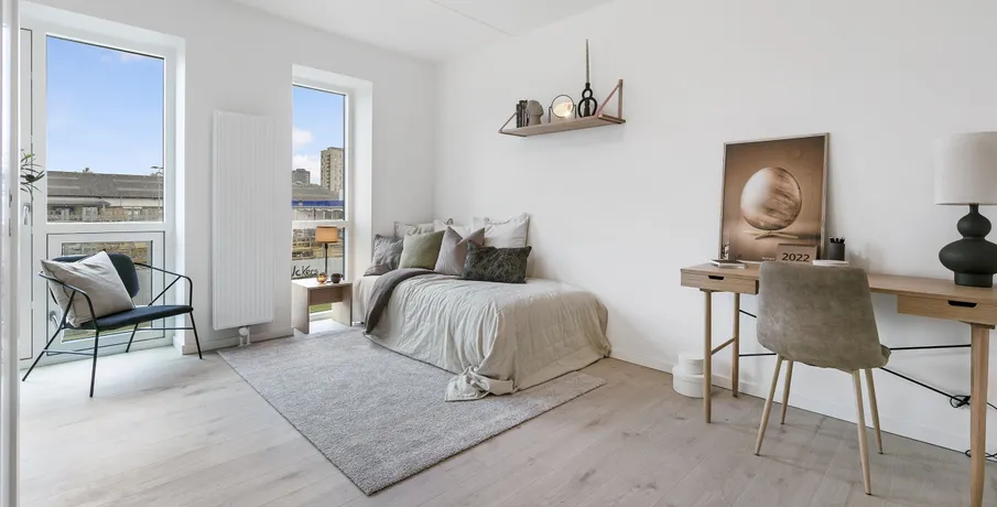 1-værelses lejlighed – Poppelstykket. Boligen. Velkommen til Poppelstykket i København SV, et moderne boligområde med funktionelle og lyse lejligheder.. Den 1-værelses lejlighed er praktisk indrettet med god pladsudnyttelse og mulighed for både sove- og opholdsplads i ét.. Ejendommen. Ejendommen tilbyder fælles køkkener, opholdsrum og vaskemuligheder, som gør hverdagen nem og bekvem. Her får du et moderne hjem med alt det nødvendige inden for rækkevidde.. Området. Poppelstykket ligger i et attraktivt område tæt på Valby Station, som giver nem adgang til resten af København.. I nærområdet finder du dagligvarebutikker, caféer, fitnesscentre og grønne områder, der gør hverdagen både nem og behagelig.. Billederne i denne annonce kan være fra lignende enheder og er kun til illustration. De repræsenterer stilen og kvaliteten af de tilgængelige enheder og kan variere i opbygning og detaljer.. Møblerne vist på billederne medfølger ikke. De skal give et indtryk af, hvordan rummet kan indrettes, men er ikke inkluderet i lejemålet..