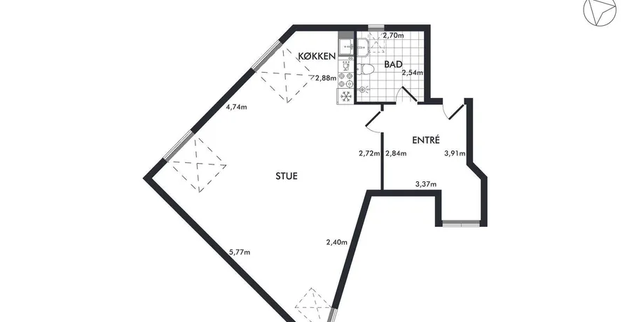 1 værelses lejlighed på 55 m2
