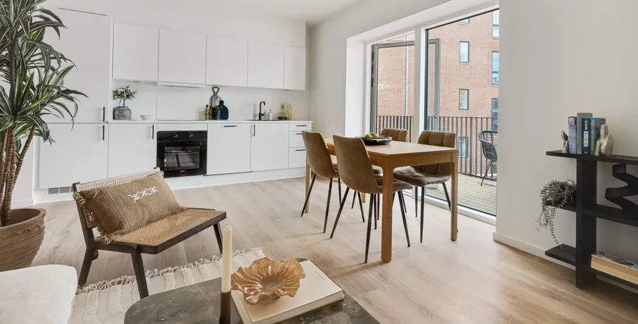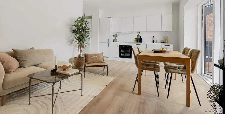 1-værelses lejlighed i Skovlunde Bymidte. De 1-værelses lejligheder er velindrettede med moderne køkken, hårde hvidevarer og vaskemaskine. Boligerne udnytter kvadratmeterne optimalt og passer perfekt til dig, der ønsker en nem og funktionel base tæt på alt.. Ejendommen Boligerne er en del af et moderne byggeri med elevator, cykelparkering og grønne opholdsarealer. I stueetagen finder du et bredt udvalg af butikker som Normal, Matas, Meny, Netto, Lagkagehuset og frisør – alt, hvad du har brug for i hverdagen.. Området Skovlunde kombinerer roligt boligliv med nem adgang til byens tilbud. Skovlunde Station ligger kun en kort gåtur væk, og S-toget bringer dig hurtigt til København. I nærområdet finder du Skovlunde Bypark, fitnesscenter, svømmehal og gode indkøbsmuligheder.. Et lyst og praktisk hjem midt i byens liv.. Billederne i denne annonce kan være fra lignende enheder og er kun til illustration. De repræsenterer stilen og kvaliteten af de tilgængelige enheder og kan variere i opbygning og detaljer.. Møblerne vist på billederne medfølger ikke. De skal give et indtryk af, hvordan rummet kan indrettes, men er ikke inkluderet i lejemålet..