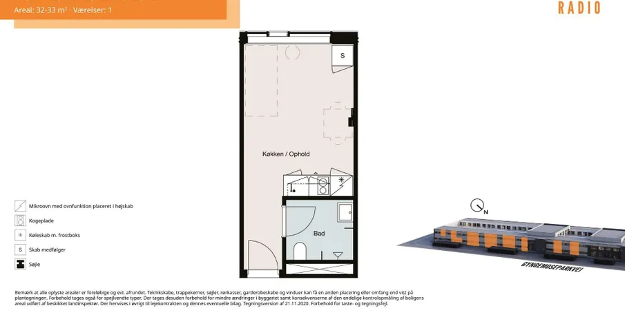 Project Radio ligger på Gyngemose Parkvej 80 i Søborg, som husede DR fra 1963 til 2007. Over de seneste år er den tidligere TV-Byen blevet omdannet til et attraktivt og livligt boligområde.Når du studerer, er det vigtigt med en tryg base at vende hjem til. Der skal være ro på de indre linjer, før der er overskud til at lære nye ting – på studiet, om livet og om relationer.Ligesom på studiet er god forberedelse guld værd, når du skal flytte ind et nyt sted. Her kan du blive klogere på, hvad du kan se frem til i din nye ungdomsbolig.Farvel til mors madgryder. Nu er det tid til, at du selv kan shine i dit eget HTH-køkken med skabsplads og en slidstærk, hvid lakering, der ligesom badeværelset er let at rengøre. Bordpladen kommer i hvid laminat.Dine hvidevarer er installeret på forhånd og er af mærket Vestfrost, hvor du får køleskab med frostboks, mikroovn med ovnfunktion, keramisk kogeplade med 2 sektioner og en udtræksemhætte. Her kan du snildt øve dig på din nye personlige hofret.Gå glad i bad. Her skal du nemlig ikke stå inde over dit toilet, når du står under bruseren. På badeværelset får du en separat bruseniche og et væghængt, vandsparende toilet fra Villeroy & Boch med indbygningscisterne. Den elegante porcelænshåndvask med underskab er designet af danske Dansani, og armaturerne er fra Grohe.Skabsplads får du også godt med. HTH-skabene har klare, hvide overflader, der er lette for dig at holde rene. Gulv og bruseniche er beklædt med matte, mørkegrå klinker, og på væggene er der tilsvarende fliser.I KÆLDERENS FÆLLESRUM FINDER DU:INDGANG TIL ATRIUM, FÆLLESKØKKEN, LOUNGE, LÆSESAL, FÆLLESLOKALE, FITNESSRUM, VASKERI OG TØRRERUM, DEPOTRUMI GÅRDRUMMET FINDER DU:OPHOLDS- OG MØDESTEDER, SOLSEJL TIL AFSKÆRMNING AF OPHOLD OG SCENE, ZONEOPDELING AF GÅRD MED BEPLANTNING.Ungdomsboligerne i Project Radio ligger i naturskønne omgivelser på grænsen til København, hvorfra du hurtigt kan ramme en supercykelsti på cyklen. Der er også gode offentlige transportmuligheder i nærheden med buslinjer, Husum St. samt den kommende letbanestation på Dynamovej.Området i Gyngemose Park er et livligt miljø med kontorerhverv og boligejendomme, der er omgivet af store, grønne fællesarealer. I dit nye nabolag finder du også butikker til de daglige indkøb, hvor Rema 1000 er få minutter væk. Skal du købe større ind, kan du lægge vejen forbi BIG Shopping Center i Herlev, hvor du bl.a. finder Elgiganten, Føtex og Sportmaster.Vil du have sved på panden, kan du dyrke sport i den lokale idrætshal Gyngemosehallen og i Blågård Svømmehal.Husdyr er ikke tilladt. NB: Ingen krav om studiekort.OBS - Billederne er fra vores 1-værelses prøvelejlighed, hvorfor de ikke nødvendigvis er retvisende for denne specifikke lejlighed. Der tages forbehold for ændringer i såvel arealer som indretning.