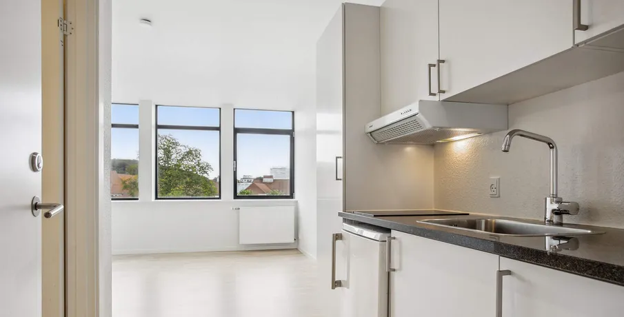 . Her kan du flytte ind i en ny renoveret 1-værelses lejlighed i centrum af Vejle.. Lejligheden indeholder badeværelse med gulvvarme, vaskemaskine, spot, væghængt toilet samt skøn bruser.. Dejligt værelse, der ligger i åben forbindelse med køkken. Køkken indeholder keramisk kogeplade, køleskab med fryser, samt emhætte.. De er adgang til dejlig stor fælles terrasse.. Det er muligt at leje p plads ved ejendommen.. Kontakt os allerede i dag for en fremvisning.. Vi viser frem alle ugens syv dage..