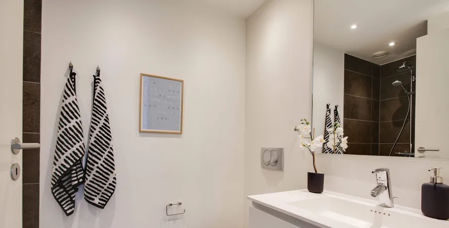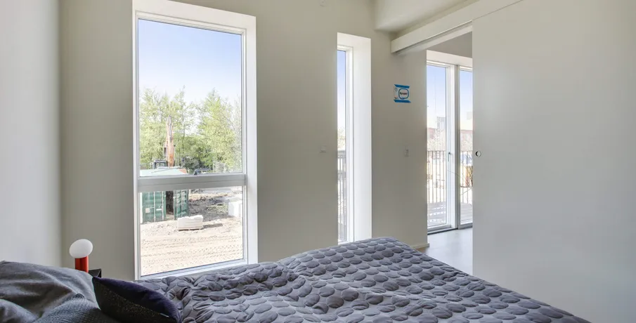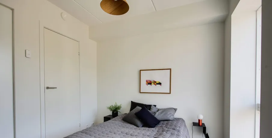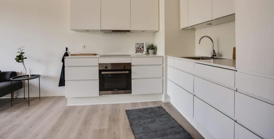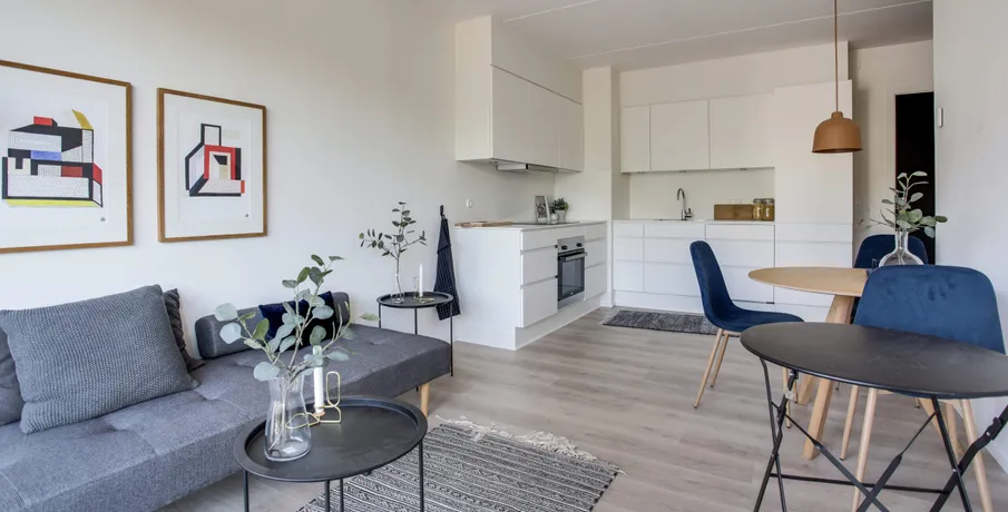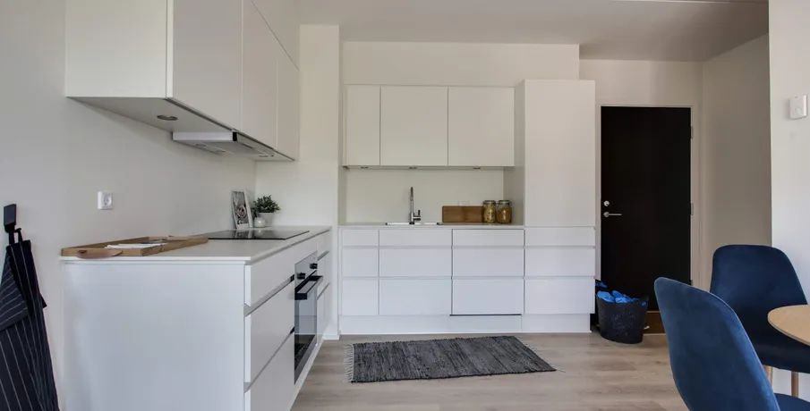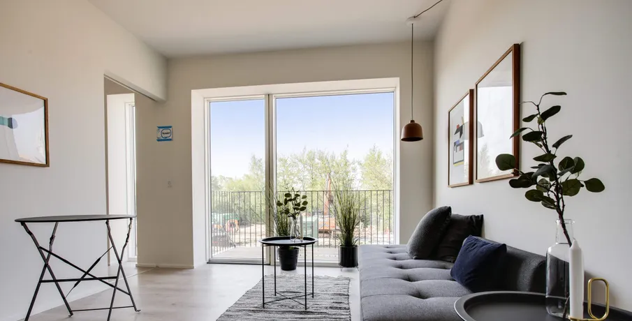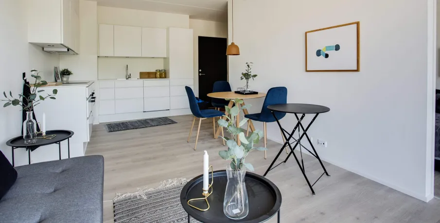 Udsigtslejlighed – her er muligheden for at leje en skøn 2-værelses lejlighed i Oasen.. Lejligheden er indrettet med entre, hvor der er mulighed for at komme af med sko og overtøj i en indbygget garderobe med LED-lys. Fra entreen er der direkte adgang til køkken og stue, hvor køkkenet indeholder køle-/fryseskab, komfur, ovn og opvaskemaskine, og herudover er der både god skabsplads og bordplads.. Fra stuen er der adgang til soveværelset, som har indbyggede skabe, og hvor man kan ligge i sengen og kigge ud over hele den grønne Oase. I lejlighedens badeværelse, som er godt udnyttet, er der installeret både vaskemaskine og tørretumbler, så det er nemt at ordne vasketøjet.. Der er desuden direkte adgang fra stuen ud til en solvendt altan, hvor der er sol fra formiddag til aften. Der er gulvvarme i hele lejligheden og der er store vinduespartier som giver et utrolig godt lysindfald i hele lejligheden.. Oasen tilbyder meget mere end blot en lejlighed:. Der er installeret fibernet i ejendommen, og der er mulighed for frit at vælge internetudbyder, der kan blandt andet vælges imellem FastSpeed, Hiper og Kviknet m.fl.. Adgang til en dele-bil:. OBS: Billederne er fra ejendommens prøvebolig, hvorfor indretningen kan variere fra dette lejemål.. Læs eventuelt mere om Oasen på linket her:. . Digterkvarteret er en spændende bydel – et sted med udvikling og stort potentiale. Med dets placering nær centrum, natur og infrastruktur er der grundlag for et enestående område, hvor børnefamilier, unge og ældre kan bosætte sig i fællesskab.. Oasen består af boliger i høj arkitektonisk kvalitet, placeret i en grøn oase væk fra byens puls.. Byggeriet danner en skærmet og tryg base for de kommende beboere, men inviterer også folk indenfor gennem de mange åbninger i bebyggelsen.. Bebyggelsen får en god spredning af boligtyper, hvilket understøtter ønsket om en bred beboersammensætning.. Der er indbygget flere forskellige boligtyper i bebyggelsen:. • Type A er 2-værelseslejligheder på ca. 50 m2. • Type B er 3-værelseslejligheder på 72-96 m2 og. • Type C er 4-værelseslejligheder på 94-117 m2. Bebyggelsen omfatter samlet set ca. 16.000 kvm fordelt på 211 boliger.. Oasen er et fredfyldt og grønt område med lejeboliger centralt beliggende øverst på Skalborg Bakke i Aalborg. Her lukker de høje bygningskroppe af for støjen, og inde bagved finder du den grønne gårdsplads med hække og eksotiske træer, hvor der er ro og fred. I de små, beplantede miljøer kan du enten trække dig tilbage i private, grønne lommer eller være sammen med dine nye naboer.. I en dal bag gårdspladsen ligger bydelens bedst bevarede overraskelse, nemlig en privat søpark omkranset af gamle træer og med små private haver, legeplads og grillområder.. Se video af kolonihavehusene og søparken:. For yderligere informationer om lejemulighederne eller for at blive skrevet på vores interesseliste, kan du kontakte. •. EMAIL