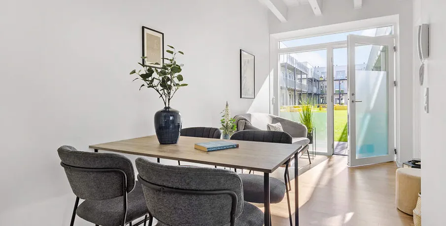 Boligerne har et godt køkken med komfur i forbindelse med boligens alrum. Derudover er der et rummeligt badeværelse med stor bruseplads. Både værelser og opholdsrum er med pæne parketgulve, mens badeværelserne har klinkegulv. Ejendommen bliver opført med lækker gårdhave og adgang til stor fælles tagterrasse. Derud over er der gode parkeringsmuligheder på terræn til din cykel. Der vil desuden på 2. sal kunne findes betalingsvaskeri samt et fint fællesrum med køkken, hvor beboere kan mødes til arrangementer og hyggestunder. *OBS* - 3D scanningen er fra en lignende bolig.