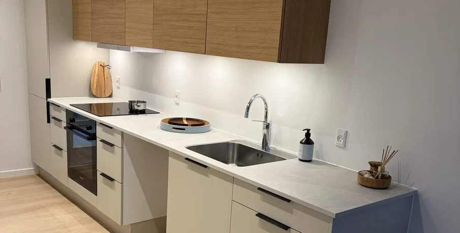 Ring for en fremvisning.. Helt nyopført Lejlighed på Fiskebrogade – tæt ved havnen.. Beliggenheden er svær at finde bedre end her. Fiskebrogade ligger i et skønt attraktivt område, hvor I både er tæt på indre by, og på samme tid bliver beriget med en helt fantastisk beliggenhed tæt ved havnen. Centrum ligger blot i en gåafstand på et par kilometer og bugner af hyggelige caféer og spisesteder, ligesom gågaden byder på en bred vifte af shopping muligheder.. I får de bedste forudsætninger til at kunne nyde de suveræne omgivelser samt stemningen ved havnen. Derudover er der gåafstand til indkøbsmuligheder. I nærmiljøet finder I også svømmestadion, cafè, padelcenter og fitness. I har også mulighed for at nyde den 660 meter lange strandpromenade ved Hjerting som ligger ca. 6 km derfra. Her kan I nyde den gode udsigt over Ho Bugt, være aktive og bade.. Lejligheden er opført, i kvalitetsmaterialer overalt og efter nogle af de nyeste energikrav. Stue og Køkken er i åben forbindelse. Herfra er der udgang til terrassen eller altan. Køkkenet er i tidløst design fra HTH, og er installeret med køle/fryseskab, ovn, samt kogeplader. Der er mulighed for at installere egen opvaskemaskine.. På nuværende tidspunkt kan du/I selv vælge, om I ønsker en lejlighed med 1 eller 2 værelser.. Badeværelse med flot arrangement i et tidløst design med bruseniche.. Her er plads til vaskemaskine og tørretumbler.. Der er privat parkering med mulighed for at lade el bil. Ejendommen er udstyret med elevator.. Drømmer du om at bo her? Så kan allerede nu sikre dig en lejlighed ved at kontakte os. Lejlighederne er klar til indflytning 20. februar 2026.. Husdyr er ikke tilladt.. Billeder er vejledende Altan Energimærket Husdyr ikke tilladt Mulighed for parkering