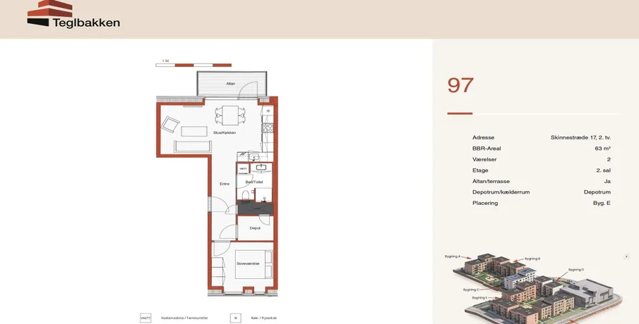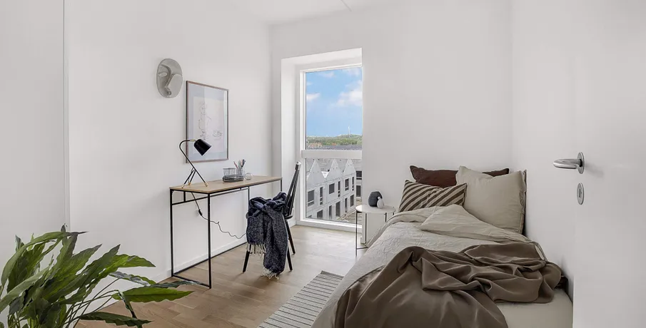 2-værelses lejlighed i Teglbakken i Hedehusene. Velkommen til Teglbakken i Hedehusene, lyse og moderne lejligheder i et roligt område tæt på stationen og byens hverdagstilbud.. De 2-værelses lejligheder har moderne køkken med hårde hvidevarer og vaskemaskine. Planløsningen er gennemtænkt og skaber en funktionel bolig med plads til både ophold og afslapning.. Ejendommen. Teglbakken er opført i gode materialer og har elevator, cykelparkering og grønne fællesområder, som skaber et trygt og behageligt miljø for beboerne.. Området. Ejendommen ligger i Hedehusene, tæt på stationen, hvor lyntoget kører til København på cirka 19 minutter. Der er gode indkøbsmuligheder, grønne parker og skoler i nærheden, herunder Læringshuset, som tilbyder moderne undervisningsrammer.. Et lyst og funktionelt hjem med alt lige i nærheden.. Billederne i denne annonce kan være fra lignende enheder og er kun til illustration. De repræsenterer stilen og kvaliteten af de tilgængelige enheder og kan variere i opbygning og detaljer.. Møblerne vist på billederne medfølger ikke. De skal give et indtryk af, hvordan rummet kan indrettes, men er ikke inkluderet i lejemålet..