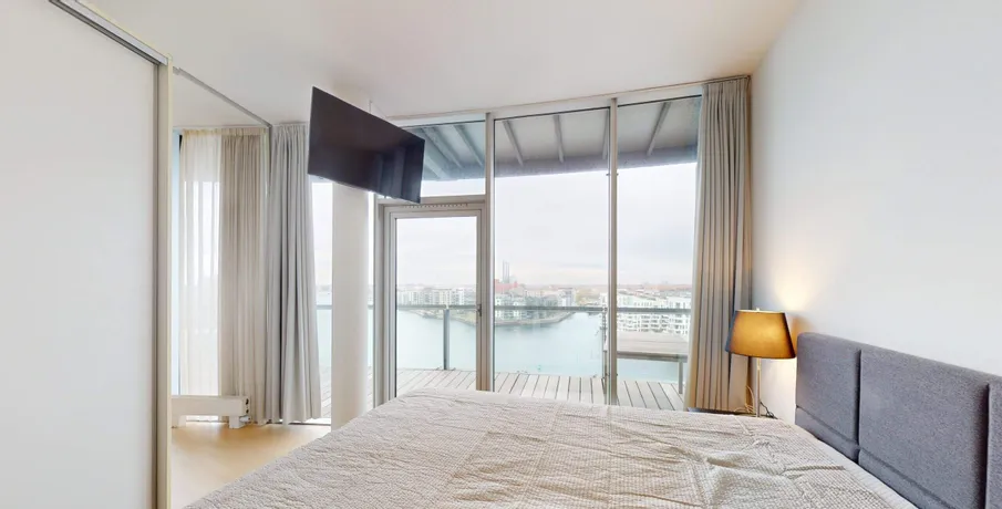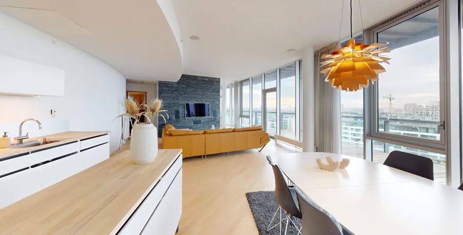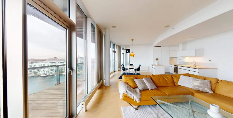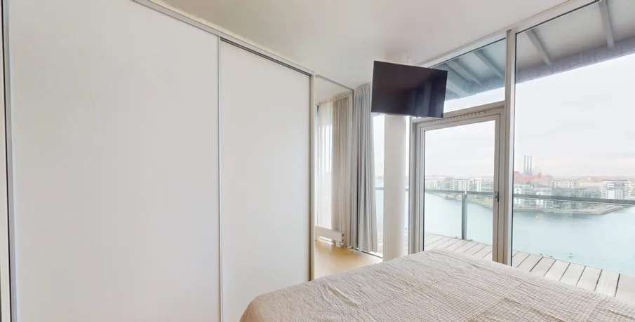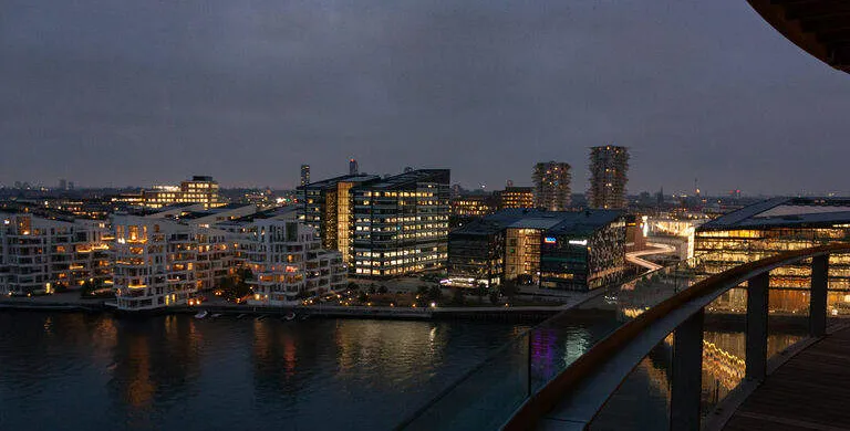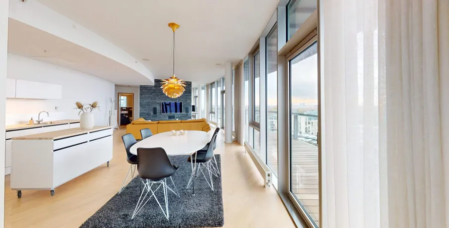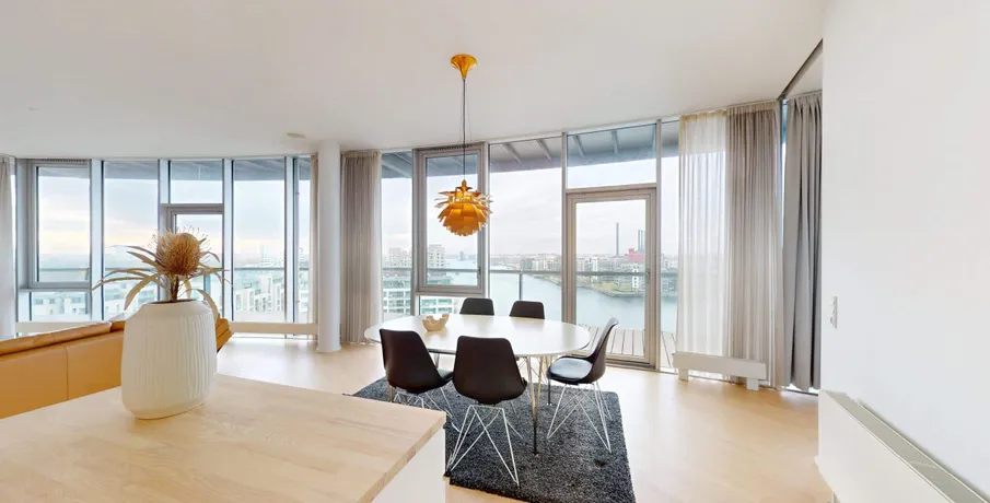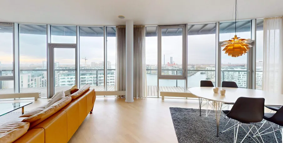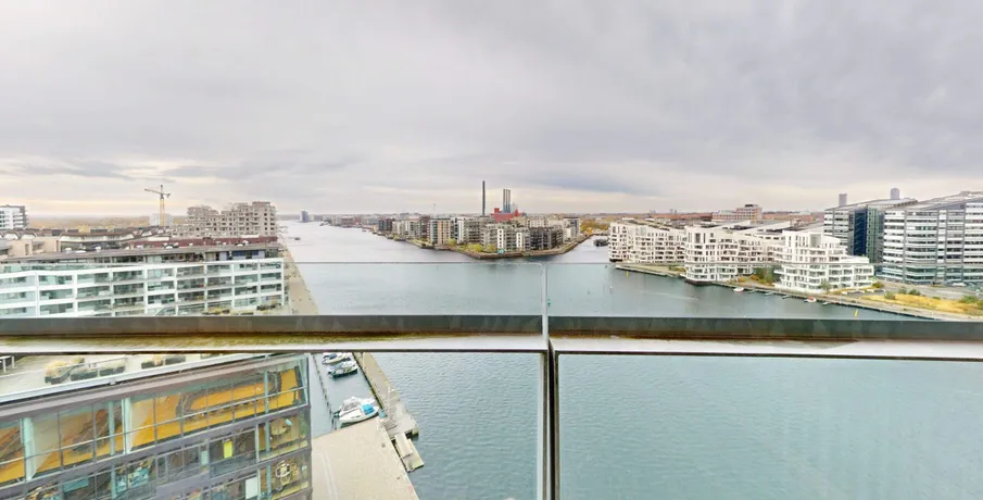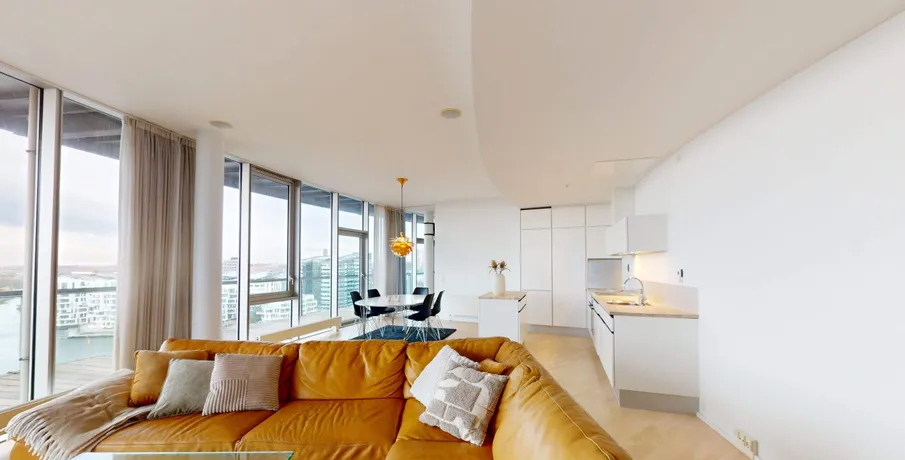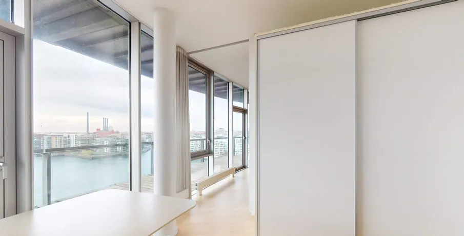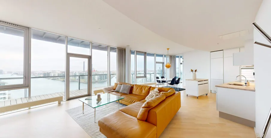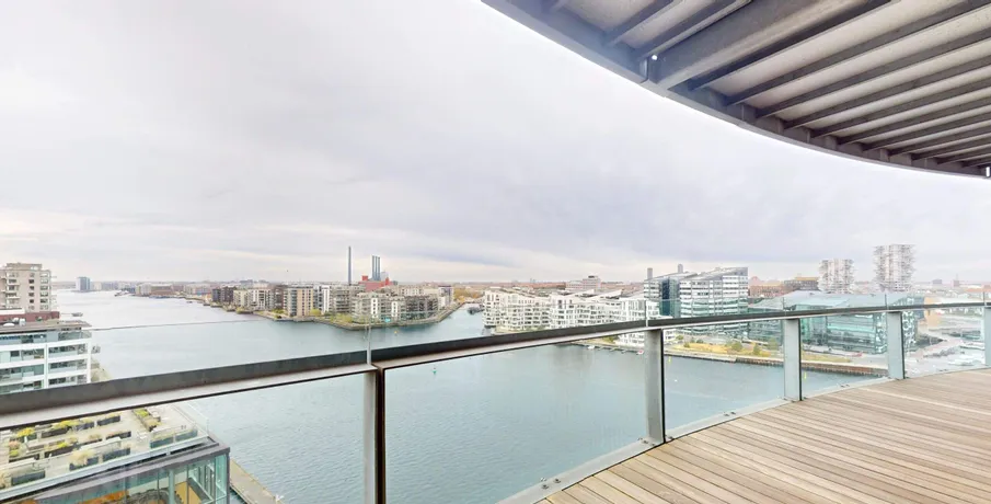 . Et hjem i himmelhøjde. Der findes boliger, og så findes der hjem, der hæver sig over det sædvanlige.. Højt hævet over havneløbet, midt i de ikoniske siloer på Islands Brygge, ligger denne unikke penthouselejlighed – en adresse, der i sig selv er et statement. Gemini Residence er kendt som et af Københavns mest spektakulære bygningsværker, hvor moderne arkitektur smelter sammen med industriens historie og skaber rammer for en livsstil ud over det ordinære.. Når man træder ind i lejligheden på Islands Brygge, åbner rummet sig straks med en imponerende fornemmelse af lys, luft og panorama. Den store stue og det åbne køkken flyder naturligt sammen – et samlingspunkt, hvor dagslyset danser gennem de markante glasfacader og forvandler stemningen fra morgenens gyldne glød til aftenens bløde skær over byen.. Herfra er der direkte adgang til begge værelser. Det ene værelse har tilknyttet et rummeligt badeværelse med vaskesøjle og eksklusivt inventar – et privat fristed, hvor design og funktionalitet mødes i elegant balance.. Men det er udenfor, på den enestående terrasse, at boligen for alvor viser sin karakter. Terrassen strækker sig i hele lejlighedens længde og indrammer udsigten som et levende kunstværk.. Du er få skridt fra vandet, fra de stemningsfulde caféer og restauranter på Bryggen og fra broen, der forbinder dig med Vesterbro og resten af byens liv.. Denne lejlighed er til dem, der søger det ekstraordinære. Til dem, der sætter pris på design, lys og rum – og som ønsker en bolig, der ikke blot er en adresse, men et udtryk for livsstil, æstetik og ambition..