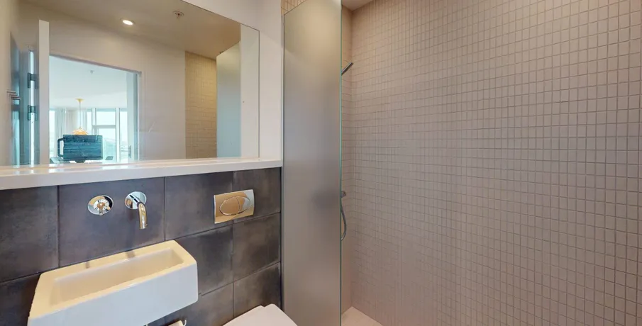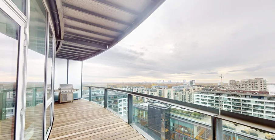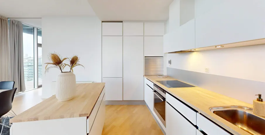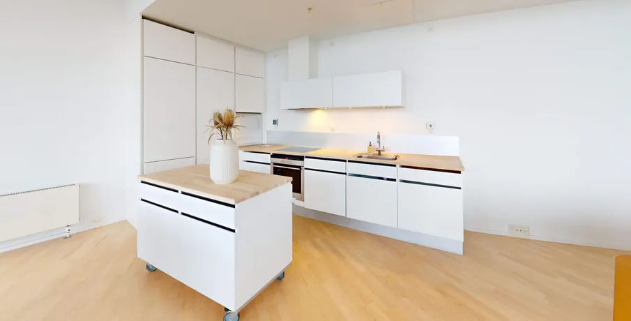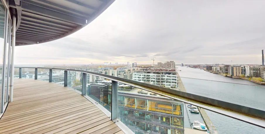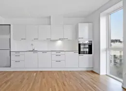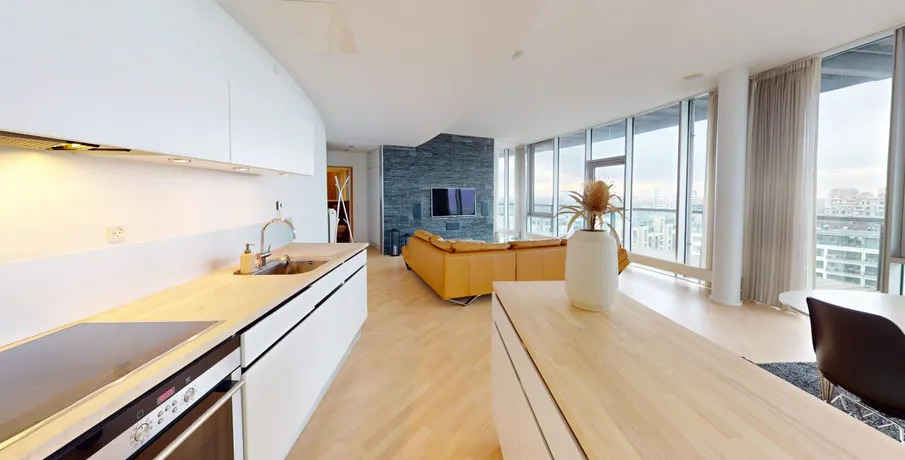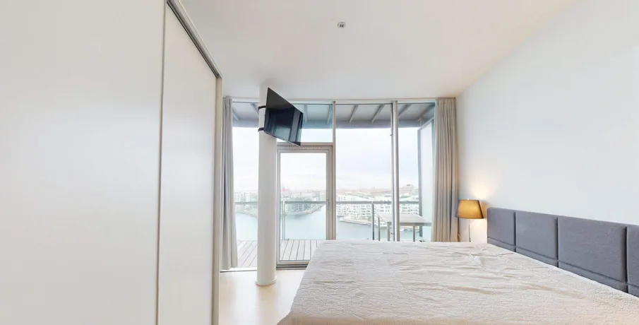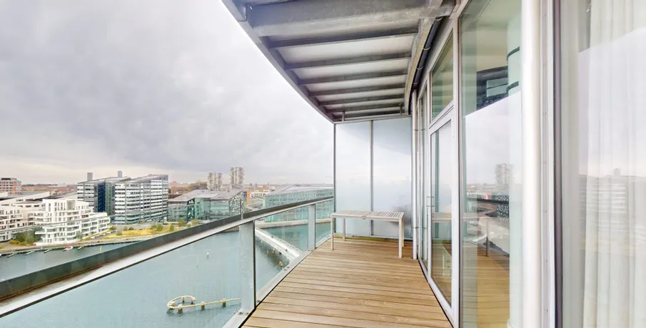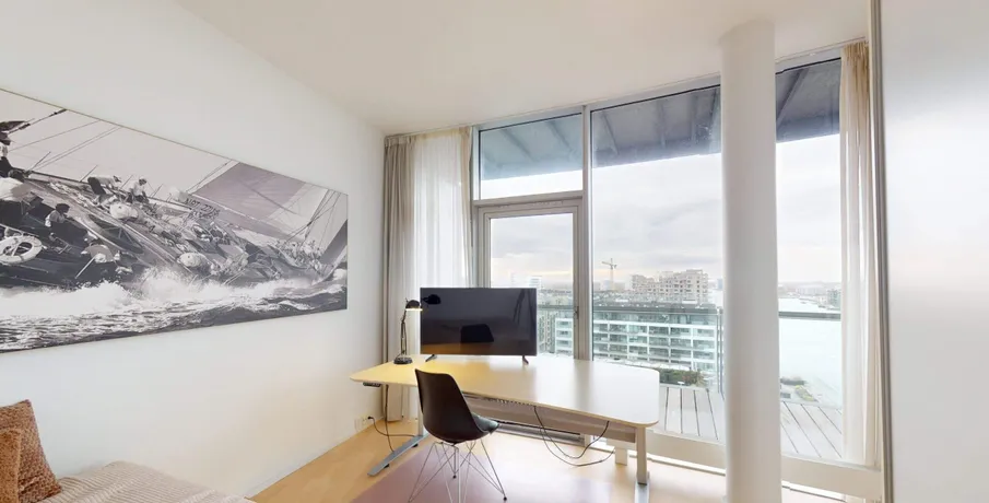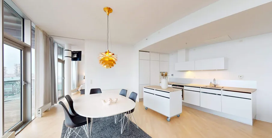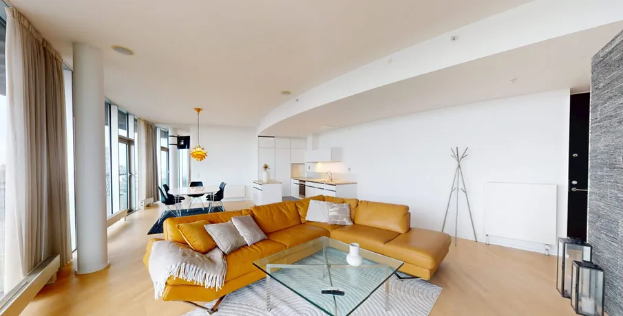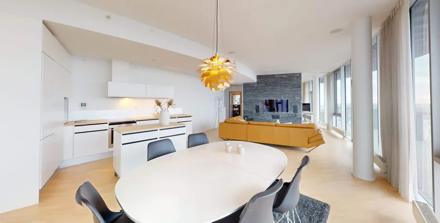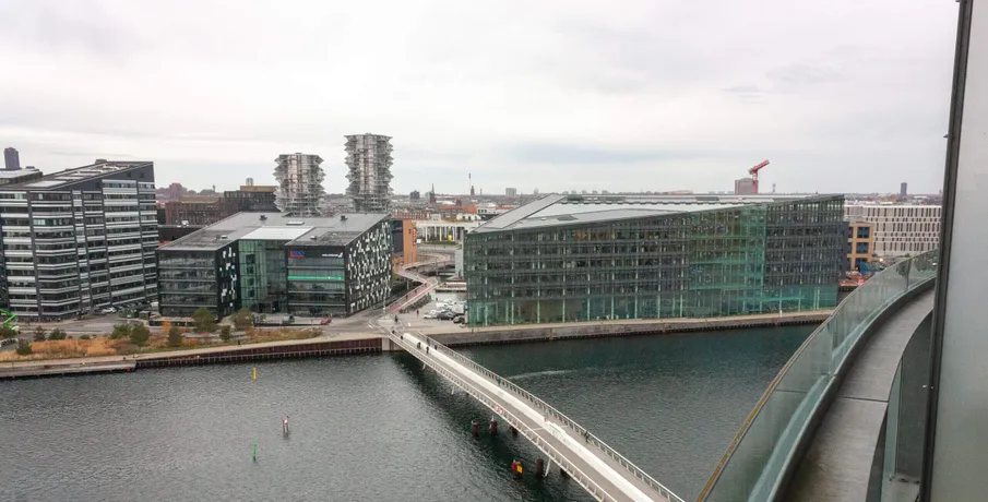 . Et hjem i himmelhøjde. Der findes boliger, og så findes der hjem, der hæver sig over det sædvanlige.. Højt hævet over havneløbet, midt i de ikoniske siloer på Islands Brygge, ligger denne unikke penthouselejlighed – en adresse, der i sig selv er et statement. Gemini Residence er kendt som et af Københavns mest spektakulære bygningsværker, hvor moderne arkitektur smelter sammen med industriens historie og skaber rammer for en livsstil ud over det ordinære.. Når man træder ind i lejligheden på Islands Brygge, åbner rummet sig straks med en imponerende fornemmelse af lys, luft og panorama. Den store stue og det åbne køkken flyder naturligt sammen – et samlingspunkt, hvor dagslyset danser gennem de markante glasfacader og forvandler stemningen fra morgenens gyldne glød til aftenens bløde skær over byen.. Herfra er der direkte adgang til begge værelser. Det ene værelse har tilknyttet et rummeligt badeværelse med vaskesøjle og eksklusivt inventar – et privat fristed, hvor design og funktionalitet mødes i elegant balance.. Men det er udenfor, på den enestående terrasse, at boligen for alvor viser sin karakter. Terrassen strækker sig i hele lejlighedens længde og indrammer udsigten som et levende kunstværk.. Du er få skridt fra vandet, fra de stemningsfulde caféer og restauranter på Bryggen og fra broen, der forbinder dig med Vesterbro og resten af byens liv.. Denne lejlighed er til dem, der søger det ekstraordinære. Til dem, der sætter pris på design, lys og rum – og som ønsker en bolig, der ikke blot er en adresse, men et udtryk for livsstil, æstetik og ambition..