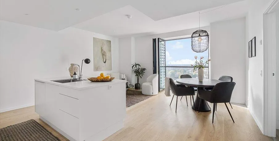 BEMÆRK!! BILLEDERNE ER AF EN PRØVELEJLIGHED!!Eksklusiv 2-værelses rummelige lejlighed udbydes nu til leje i det populære Carlsberg Byen beliggende i Pasteurs Tårn, som er Københavns højeste beboelsesejendom i 120 meter højde.Lejligheden har en optimal planløsning og har udnyttet hver eneste kvadratmeter til det yderste. I forbindelse med lejlighedens entré kommer du ind i lejlighedens køkken med plads til spisebord. Køkkenet er et åbent køkken fra HTH og stilen er minimalistisk med grebsløst design, hvid bordplade og hårde hvidevarer fra Miele med dertilhørende køkkenø. Fra køkkenet og dets spiseplads ledes man direkte ud til lejlighedens franske altan med foldedør, hvor du har mulighed for at nyde lejlighedens udsigt til den resterende del af København. Fra køkkenet kommer man til stuen, som er tilbagetrukket fra lejlighedens entre. Dette giver en essentiel dybe og rød tråd i lejligheden. I forlængelse af stuen ledes man ind i lejlighedens soveværelse. Badeværelset er indrettet med skuffemoduler, vaskesøjle (vaskemaskine og tørretumbler fra Miele) og en håndvask i kunstmarmor fra Marmorline. Badeværelsets vægge og gulve er grå fliser fra Evers Europé. Generelt en lejlighed udført i minimalistisk og nordisk stil med øje og respekt for æstetikken. Du får hvidpigmenteret lamelplank og lakeret eg fra BOEN på gulvene inkl. gulvvarme i hele lejligheden. Armaturerne i lejligheden er fra Grohe og hårde hvidevarer fra MieleLejligheden er beliggende i ejendommen kaldet Pasteurs Tårn - og den nye trendy bydel, Carlsberg Byen.Til lejligheden: Alle hårde hvidevarer, vaskemaskine, tørretumbler, opvaskemaskine, ovn og kogeplade.Til ejendommen: Kælderrum, cykelkælder, gårdmiljø. Der forefindes parkeringspladser til ejendommen mod betaling.Velkommen til!