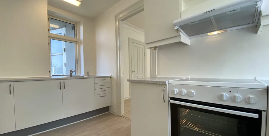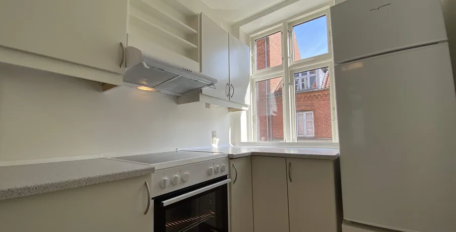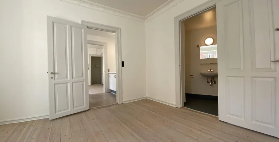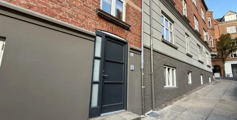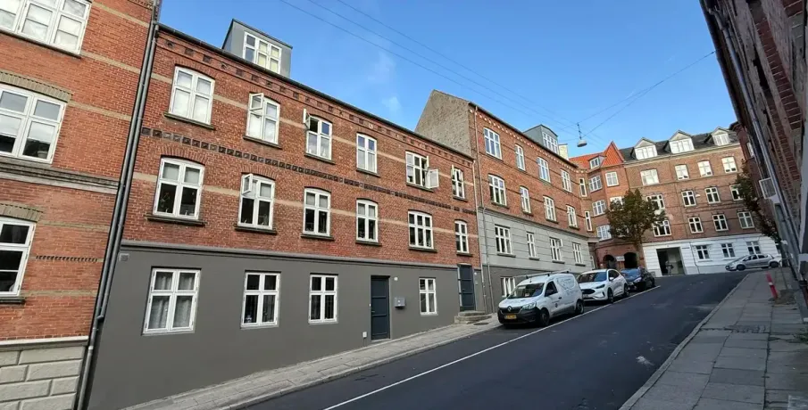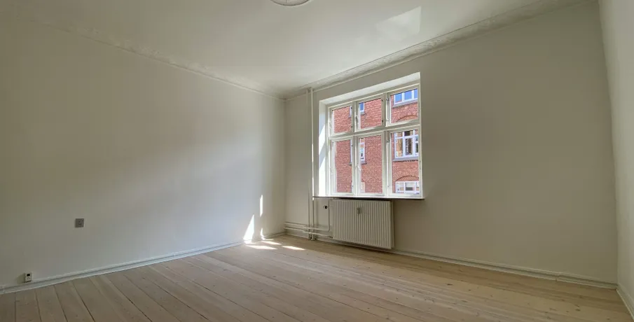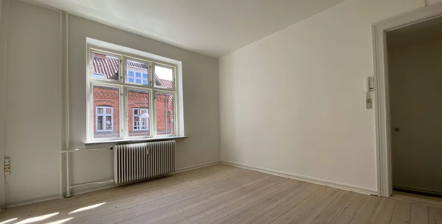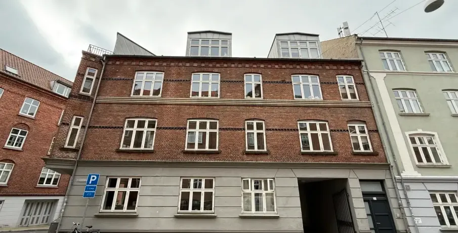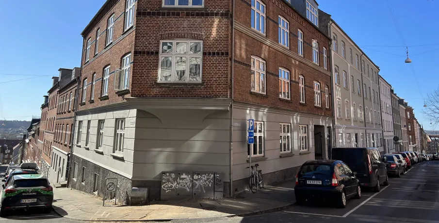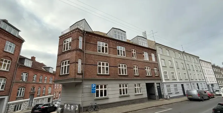 Beliggenhed. Centralt beliggende og renoveret hjørneejendom. Beliggende tæt på banegården og byens centrum, med et stort udvalg af indkøbsmuligheder. Der er fælles gårdhave til ejendommen, der samtidig giver adgang til stort fælles gårdhavemiljø i området. Børneinstitutioner og skoler i gåafstand.. Faciliteter. Vaskefaciliteter henvises. Øvrigt. Dørtelefonanlæg. Altaner på de fleste lejemål. Afhøvlede massive trægulve og stuklofter..