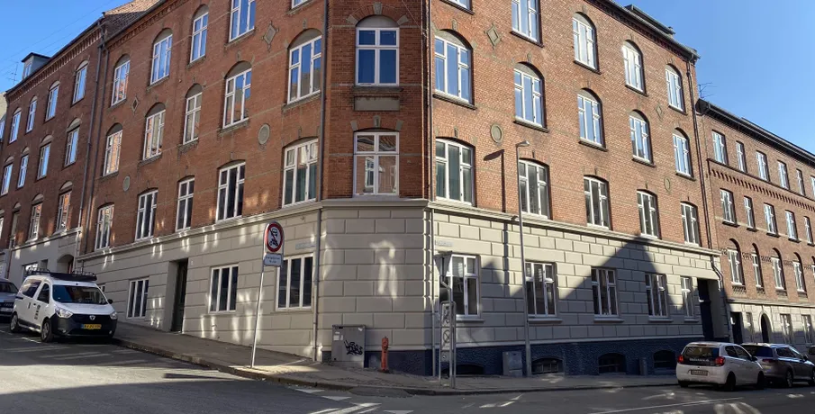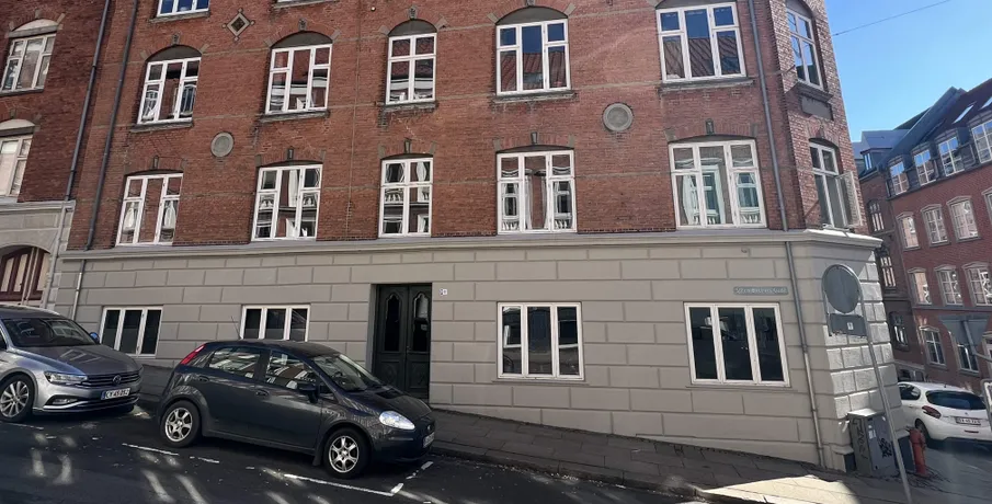 Beliggenhed. Centralt beliggende og renoveret hjørneejendom, tæt på banegården, offentligt parkanlæg og med byens centrum i gåafstand med et stort udvalg af indkøbsmuligheder. Der er fælles gårdhave til ejendommen. Børneinstitutioner og skoler i gåafstand.. Faciliteter. Vaskefaciliteter henvises.. Øvrigt. Afhøvlede massive trægulve og stuklofter..