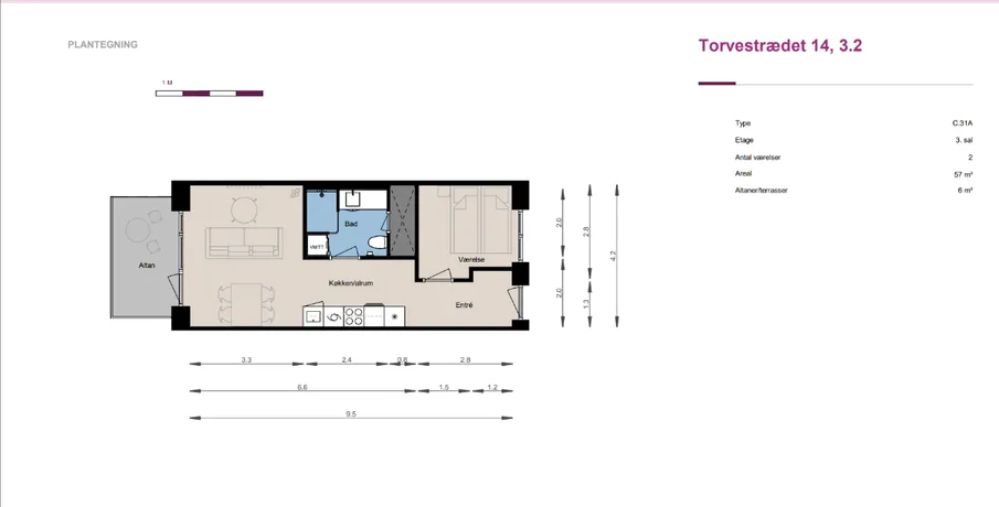 2 værelses lejlighed på 57 m2