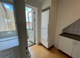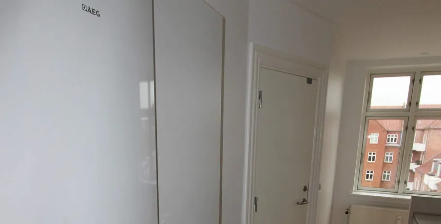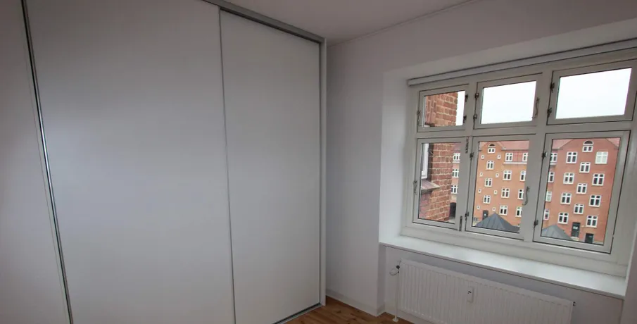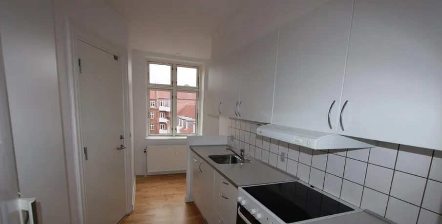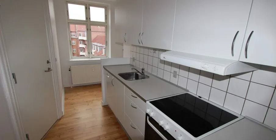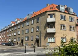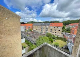 . Renoveret lejlighed med vaskesøjle og parkering. Super flot renoveret lejlighed med lakerede askeparketgulve overalt i lejligheden. Dejligt soveværelse med indbyggede skabe. Lyst køkken med hvidt køkkeninventar, opvaskemaskine og lille spiseplads. Badeværelse med gulvvarme, hvide skabselementer og vaskemaskine og tørretumbler. Husdyr ikke tilladt.. Ejendommen, som er opført i 1920 og løbende moderniseret, er beliggende i Vejle Vestby nær centrum. Ejendommen er en del af en boligkarré bestående af 143 lejligheder. I kælderen er der fælles vaskeri, tørrerum og cykelrum. Til hver lejlighed er der ligeledes et pulterum. Tilhørende ejendommen er der en stor asfalteret gård med parkeringspladser, cykelskure og legeplads..