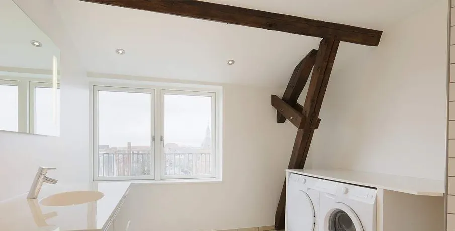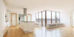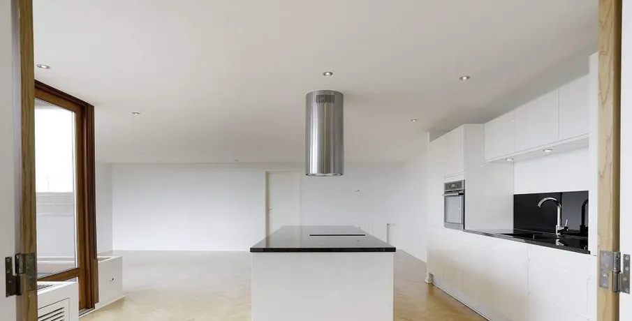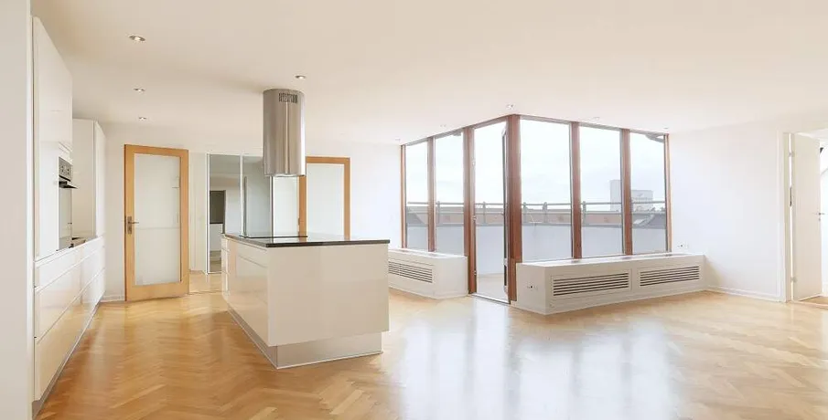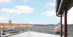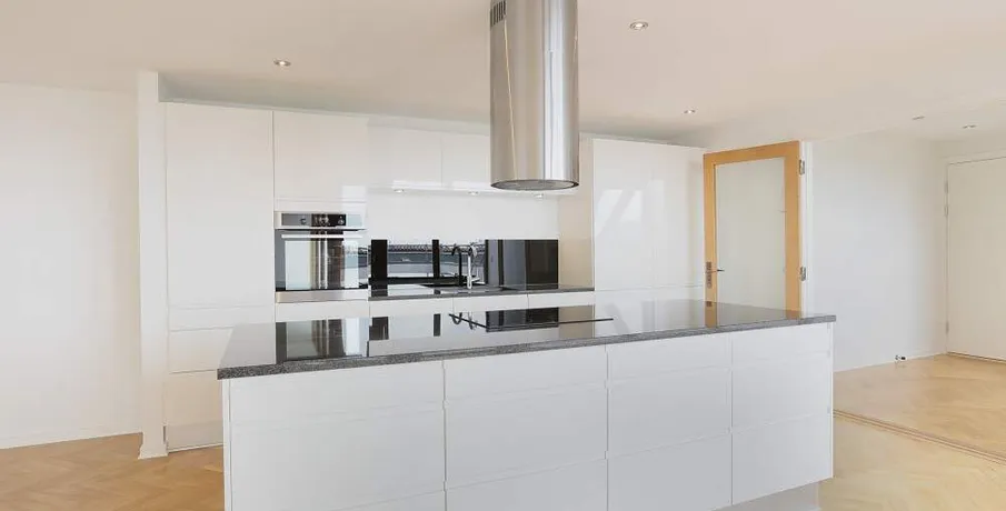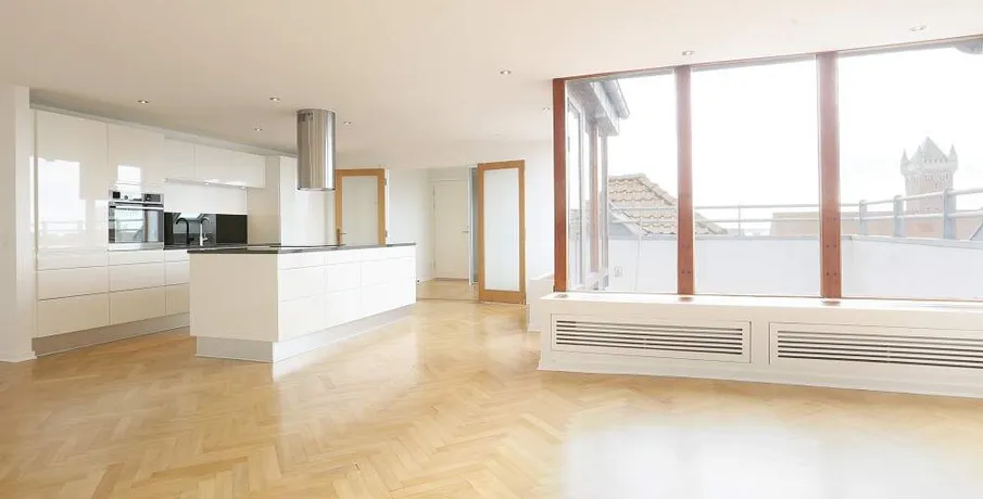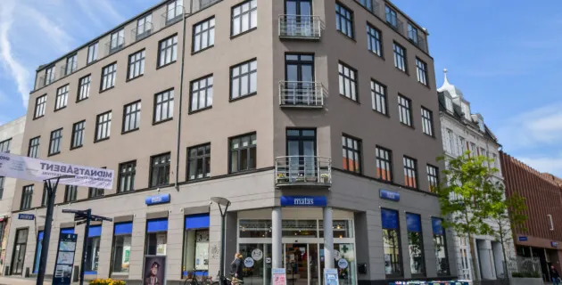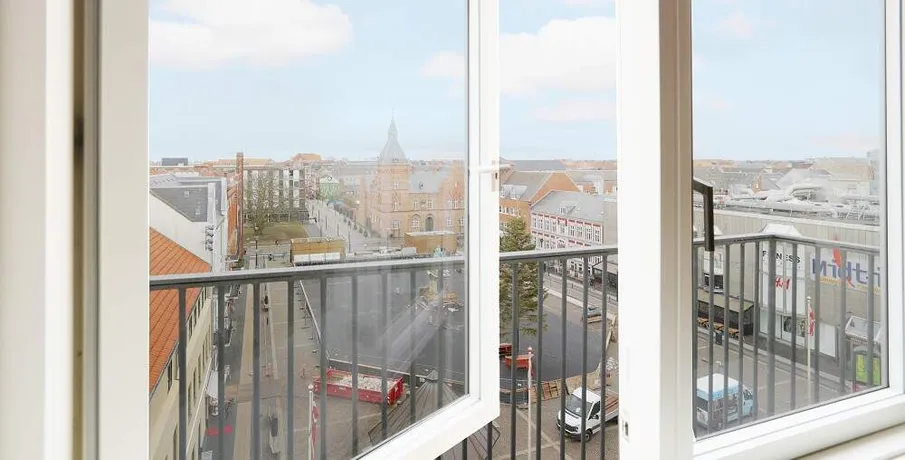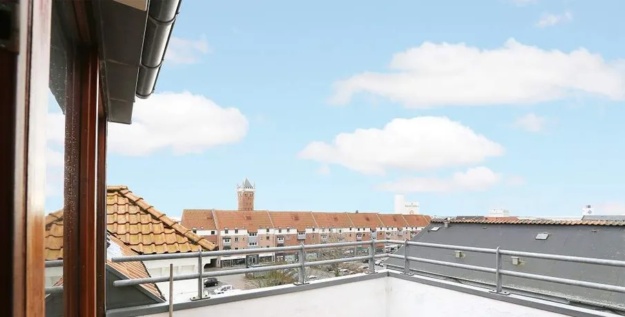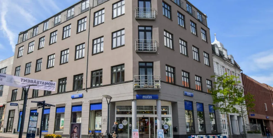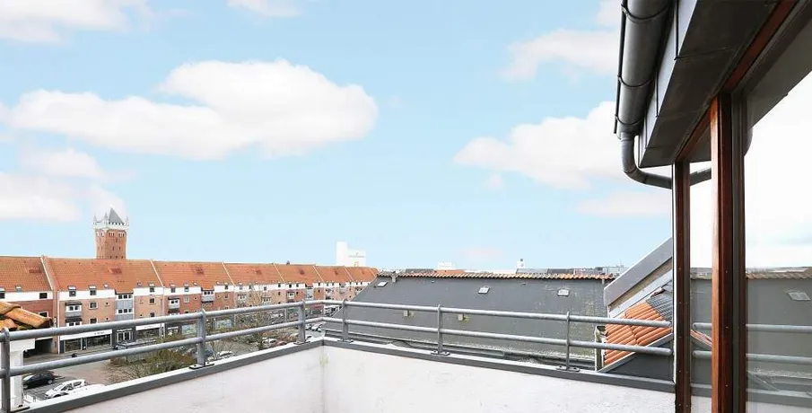 Denne moderne og unikke herskabslejlighed er nyetableret i 2013, og ligger på 4. sal i den markante hjørneejendom, der huser Matas på Torvet.. Indgang sker fra via en lys og bred trappeopgang med klinketrapper.. Inde i lejligheden mødes man af en lys entre med hvidmalede vægge, store indbyggede skabsvægge med skydelåger og spejle samt LED spots.. Der er i det hele taget kræset for detaljerne, og lejligheden er bl.a. indrettet med flotte sildebensparket i alle opholds rum.. Fra entreen kommer man via en dobbelt glasdør til det dejlige lyse køkkenalrum hvor et hvidt højglans Designa køkken ligger i åben forbindelse med stor kombineret spise- og opholdsstue.. Køkkenet har massive sorte granitbordplader og rigeligt med skabsplads.. Fra stuen er der udgang til en privat vestvendt terrasse med udsigt over byens tage og med kig til havnen og Fanø.. Badeværelset er indrettet med bruseniche, vaskeskab, spejl m/integreret lys, vaskesøjle, hvide vægge og granit klinker, ligesom der også her er indbygget LED spots i loftet.. I lejlighedens rummelige soveværelse forefindes stor indbygget skabsvæg med skydelåger med spejle, hvilket også er tilfældet på børneværelset/kontoret.. Fra soveværelset og badeværelset er der desuden udsigt over Torvet.. Herudover er der bl.a. etableret dørtelefon, internet- og TV stik, og i køkkenet er der integreret opvaskemaskine, store kølefryseskabe m.m.. Der er desuden mulighed for leje af p-plads efter ønske.. HUSDYR ER IKKE TILLADT I EJENDOMMEN!