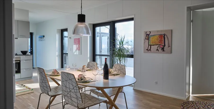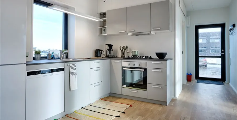 Fleksibilitet, høj kvalitet samt minimal spildplads er 3 nøgleord, for denne nye unikke boligform som nu udbydes til salg i Gudenåparken i Tørring. Tiny-house fra Mobilehouse er Svanemærket, og dokumenterer at boligbyggeriet er opført bæredygtigt og alle benyttede materialer er screenet for farlige stoffer. Samtidig skal boligbyggeriet mindst være 10% bedre end den gældende lovgivning i forhold til energirammen, som sikrer dig et minimalt forbrug til opvarmning, som sker via varmepumpe og solcelleanlæg på taget. Indeklimaet sikres med en microvent decentral ventilation med 92% varmegenvinding. Tiny-house er produceret indendørs, så her er ingen fugt-udfordringer. Tiny-house finder du:· Entré· Badeværelse med plads til vaskemaskine og teknik· Stort køkken/alrum med flot egetræsparket· 2 værelser med faste skabeOg en lækker udendørs terrasse i lærketræ på ca. 13 kvm samt et tilhørende redskabsskur.Husdyr er ej tilladt