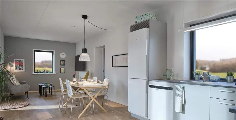 Fleksibilitet, høj kvalitet samt minimal spildplads er 3 nøgleord, for denne nye unikke boligform som nu udbydes til salg i Gudenåparken i Tørring. Tiny-house fra Mobilehouse er Svanemærket, og dokumenterer at boligbyggeriet er opført bæredygtigt og alle benyttede materialer er screenet for farlige stoffer. Samtidig skal boligbyggeriet mindst være 10% bedre end den gældende lovgivning i forhold til energirammen, som sikrer dig et minimalt forbrug til opvarmning, som sker via varmepumpe og solcelleanlæg på taget. Indeklimaet sikres med en microvent decentral ventilation med 92% varmegenvinding. Tiny-house er produceret indendørs, så her er ingen fugt-udfordringer. Tiny-house finder du:· Entré· Badeværelse med plads til vaskemaskine og teknik· Stort køkken/alrum med flot egetræsparket· 2 værelser med faste skabeOg en lækker udendørs terrasse i lærketræ på ca. 13 kvm samt et tilhørende redskabsskur.
