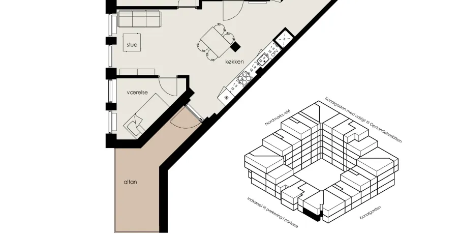 Lejligheden er moderne og lyst indrettet med et flot lysindfald fra de store vinduespartier. Alle lejligheder har direkte adgang til egen terrasse eller altan, så livet også kan nydes udenfor blot ved at åbne terrassedøren og man er ligeledes sikret en flot udsigt over Albertslund.Ejendommen er udviklet med fokus på at skabe et unikt seniorbofællesskab. Derfor har du som beboer adgang til fællesfaciliteter såsom tagterrasse med en motionssti og siddemiljøer, et stille og roligt gårdrum med orangeri, et fælleskøkken og spisefaciliteter med tilhørende terrasse og ikke mindst et hobbyrum, hvor der eksempelvis vil være værksted.Der er elevator i alle opgange, så man nemt kommer til sin bolig direkte fra gaden eller fra bilparkeringen.Til hver lejlighed følger et depotrum, hvor du kan opbevare de ting, som du ikke bruger så ofte. Der er derudover mulighed for at leje en p-plads i parterre.