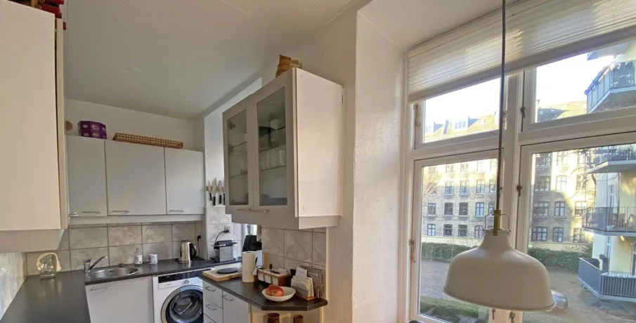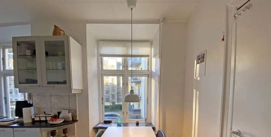 . Tæt på Søerne på charmerende Frederiksberg finder du denne hyggelige, møblerede lejlighed til leje for en 6 måneders periode fra 1. maj. Lejlighedens 77 m2 fordeler sig på entré med garderobe, hyggeligt spisekøkken, stue, spisestue, soveværelse og badeværelse med brus. Fra spisestuen er der udgang til en dejlig altan med god plads og udsigt til grønt fællesareal. Lejligheden ligger tæt på indkøb, Forum Metro station og øvrig offentlig transport, butikker, caféer, restauranter, fitness og Frederiksberg mange andre fristelser. Lejligheden kan bebos både med og uden bopælsregistrering..