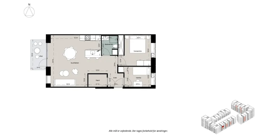 3 værelses lejlighed på 87 m2