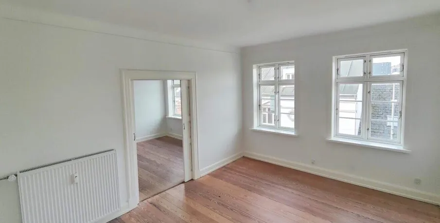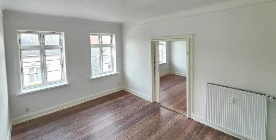 . Smuk og rummelig 3-værelses lejlighed centralt beliggende i Kjellerup.. Ved indgangen til lejligheden mødes du af en lang fordelingsgang, der fører dig til det hyggelige køkken, badeværelse, soveværelse og den store, “dobbelte” stue.. Køkkenet har masser af skabsplads, keramisk komfur og et stort køle-fryseskab. Der er også plads til en lille spisekrog til et par personer.. Badeværelset er ligeledes med lyse klinker, håndvask, toilet og en stor bruseniche. Der er forberedt til installation af en vaskemaskine.. Det store soveværelse har udsigt over baggården.. Lejligheden har to store stuer – eller en stue og et værelse, om man vil. De to stuer er adskilt af to skydedøre, som kan skubbes ind i væggen.. Overalt i lejligheden finder du en lys og indbydende atmosfære med originale gamle plankegulve og højt til loftet.. Depositum svarer til 3 måneders husleje, og der er en månedlig a’conto betaling til dækning af varme og vand.. Kontakt os gerne for en fremvisning