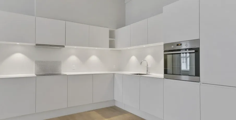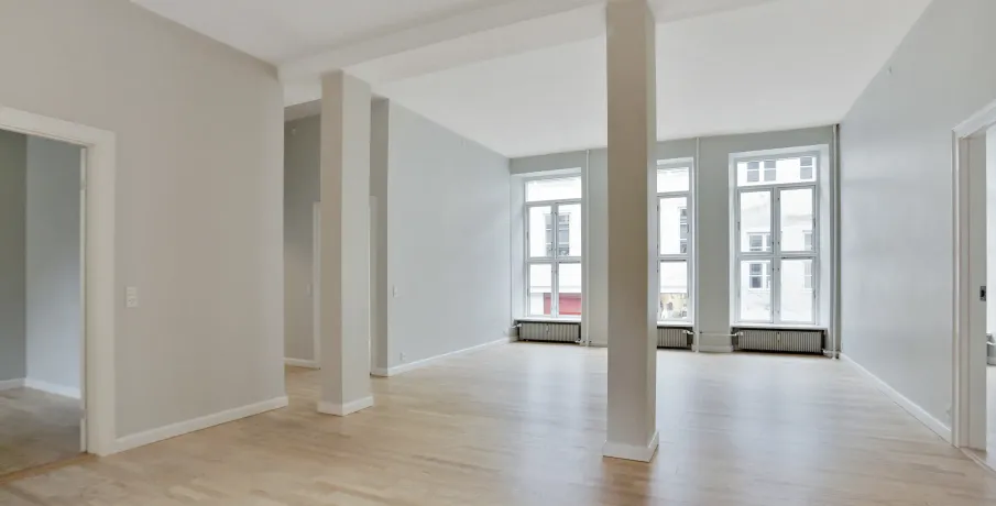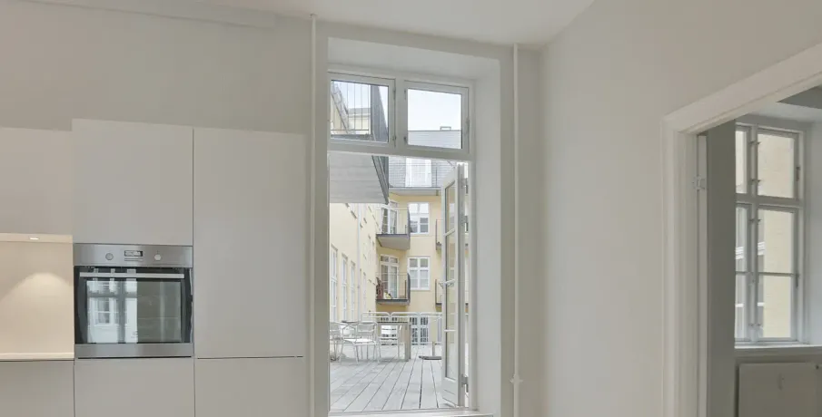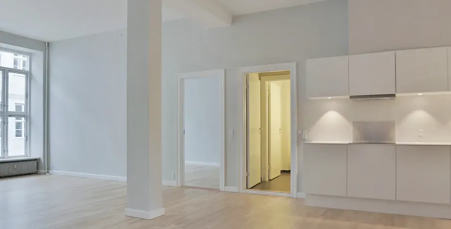 Helt i tidens ånd udgør køkken-alrum og stue et stort, åbent leverum, hvor man kan indrette sig kreativt. Køkkenet står skarpt med hvide, grebsfrie elementer og lækre hårde hvidevarer i børstet stål. Den åbne forbindelse til stuen bevirker, at man kan kokkerere og samtidig deltage i det sociale liv, hvad enten gæsterne tager plads i sofagrupperne foran stuens store vinduespartier eller ved spisebordet midt i rummet. Badeværelser er indrettet med glasbruseniche og kombineret vaskemaskine og tørretumbler.Der vil i forbindelse med anmodning om leje af boligen, blive fortaget en kreditvurdering af kommende lejer ved anvendelse af CPR-nummer. Det er ikke tilladt at være registreret i RKI, hvis man vil leje en bolig.OBS! Billederne er ikke fra den specifikke bolig.
