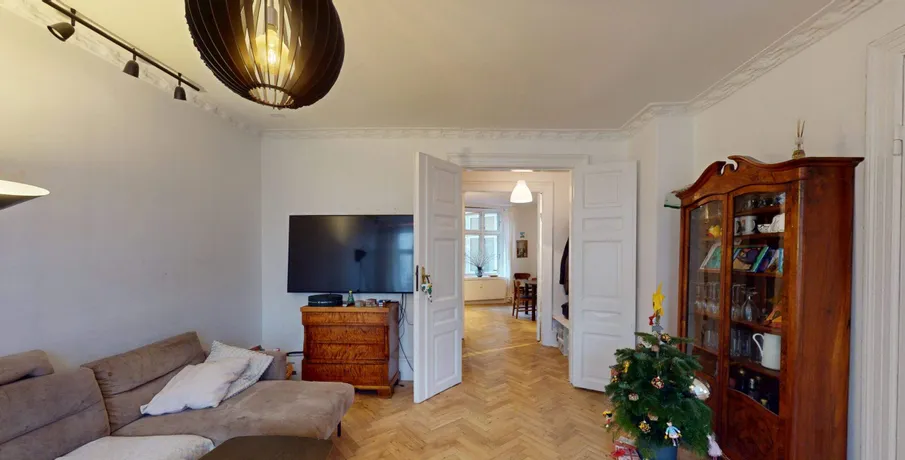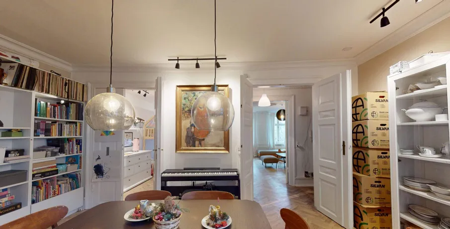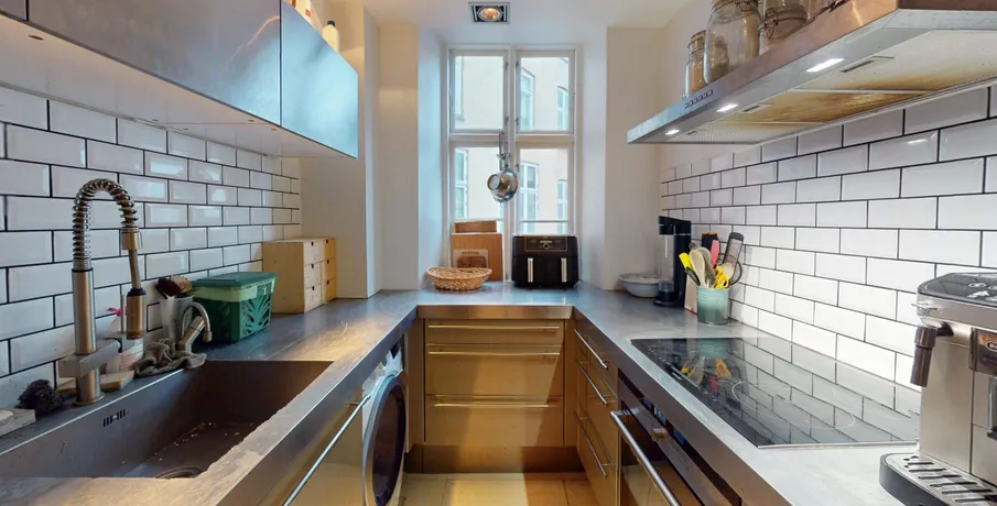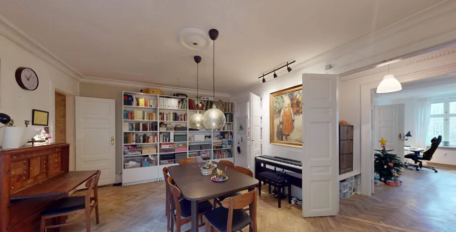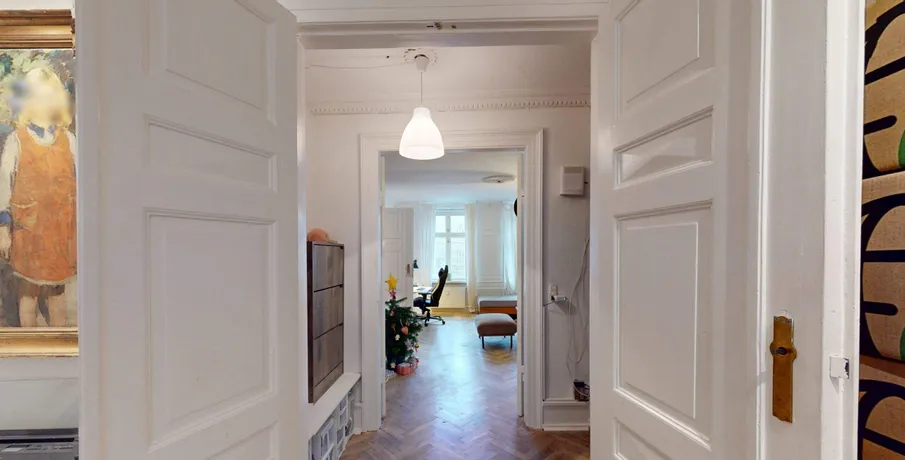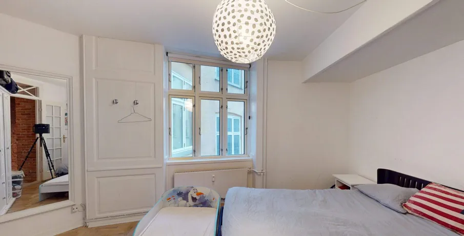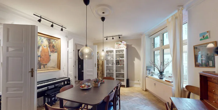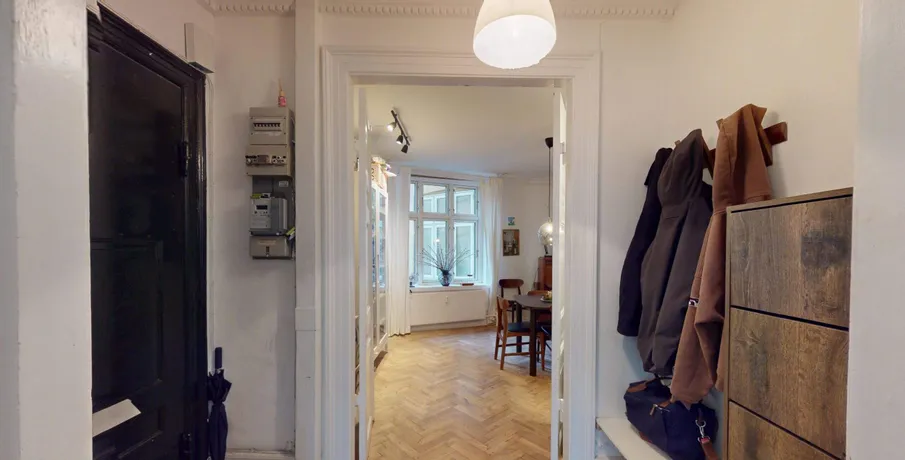 . Eksklusiv og rummelig lejlighed i hjertet af København.. På en af Københavns mest eftertragtede adresser, lige ved Nørreport, finder du denne smukke og yderst veldisponerede lejlighed, der kombinerer klassisk charme med rummelige og funktionelle løsninger. Her får du en bolig med en planløsning, der passer perfekt til både par, familien eller dem, der ønsker god plads midt i byen.. Lejligheden byder dig velkommen i en stor og indbydende entré med god loftshøjde og masser af plads til både overtøj, sko og opbevaring. Entréen fungerer som et naturligt fordelingspunkt i boligen, hvorfra der er adgang til flere af lejlighedens centrale rum.. Fra entréen træder du ind i den store stue, som imponerer med sit flotte lysindfald og rummelighed. Her er der rig mulighed for at indrette både opholds- og afslapningsområde. I forlængelse heraf finder du den separate spisestue, som danner den perfekte ramme om middage med familie og venner. De to stuer giver tilsammen en elegant og klassisk atmosfære med masser af plads til både hverdag og fest.. Lejligheden rummer desuden to store og velproportionerede soveværelser, begge med god plads til seng, skabe og eventuelt hjemmearbejdsplads. Værelserne er roligt placeret i boligen og egner sig både som soveværelser, børneværelse eller kontor, alt efter behov.. Forenden af lejligheden finder du det rummelige badeværelse, som fremstår funktionelt med god plads og praktisk indretning. I samme ende ligger det hyggelige køkken, der byder på fine arbejdsforhold, god opbevaringsplads og mulighed for en mindre spiseplads. Køkkenet har en varm og indbydende stemning og fungerer perfekt til både hverdagsmadlavning og hyggelige stunder.. Beliggenheden er ganske enkelt i særklasse. Med Nørreport Station som nærmeste nabo har du adgang til byens absolut bedste transportknudepunkt med metro, S-tog, regionaltog og busforbindelser – alt sammen lige uden for døren. Samtidig er du omgivet af et rigt byliv med caféer, restauranter, specialbutikker og kulturelle tilbud i verdensklasse. Inden for få minutters gang finder du grønne oaser som Ørstedsparken og Botanisk Have, ligesom Indre By, Torvehallerne og Københavns Universitet ligger lige i nærområdet.. Her får du en bolig, hvor beliggenhed, rummelighed og klassisk københavnsk atmosfære går op i en højere enhed – en sjælden mulighed for at bo midt i byen med alt, hvad København har at byde på, lige ved hånden..