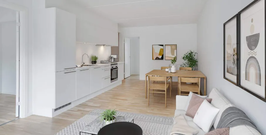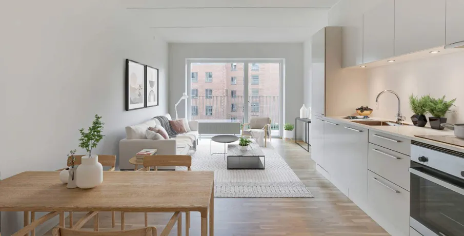 3-værelses lejlighed – Green Square Garden. Boligen. De 3-værelses lejligheder er ideelle til både par og mindre familier, der ønsker en moderne bolig med plads til samvær og ro. Planløsningen byder på to gode værelser, et lyst opholdsrum og et køkken i åben forbindelse, som gør rummet indbydende og socialt. Badeværelset er opført i lyse materialer, og flere boliger har egen altan eller terrasse.. Ejendommen. Green Square Garden tilbyder trygge rammer med grønne fællesarealer, elevator og gode adgangsforhold. Byggeriet er opført i moderne design og med fokus på komfort og kvalitet i hverdagen.. Området. Området omkring Green Square Garden byder på alt, hvad du behøver i dagligdagen – indkøb, spisesteder, fitness og grønne parker. Med metroen tæt på er der hurtig adgang til resten af København, mens Amager Strand kun er en kort cykeltur væk.. Billederne i denne annonce kan være fra lignende enheder og er kun til illustration. De repræsenterer stilen og kvaliteten af de tilgængelige enheder og kan variere i opbygning og detaljer.. Møblerne vist på billederne medfølger ikke. De skal give et indtryk af, hvordan rummet kan indrettes, men er ikke inkluderet i lejemålet..