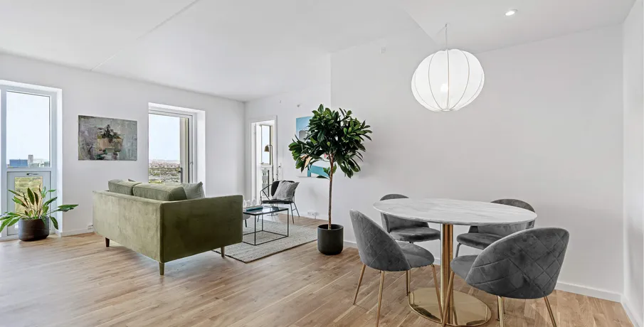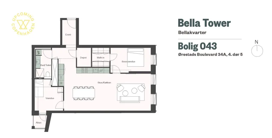 OBS! Billederne er fra prøvebolig. Ejendommen. Bella Tower er tegnet af COBE og Vilhelm Lauritzen Arkitekter, og ejendommen er et markant islæt for indgangen til Bellakvarter. Det 60 meter høje boligtårn er designet i et hvidt grid af rå betonelementer, som er placeret på en mørk murstensbase, der danner rammen omkring et grønt, naturrigt gårdmiljø. Boligerne i basen går op til 5. sal og har altaner eller tilbagetrukne terrasser ud til gården, mens tårnet skyder 18 etager op og har altaner hele vejen rundt. Ejendommen består af i alt 199 lejligheder med 2-6 værelser. Udsigt over hele Ørestad og Amager Fælled. Tårnet er tegnet med 360 graders altaner i forskellige dybder, som varierer fra franske altaner til opholdsaltaner. Det giver mulighed for et rigt udeliv, hvor man kan gå udenfor fra alle værelser og nyde den ubrudte udsigt ud over Ørestad og ind over Amager Fælled til Københavns Skyline. Boligerne Boligerne har et stilrent og nordisk look og er opført i lækre materialer såsom flotte egetræsgulve og store vinduespartier. De store vinduespartier giver et dejligt lysindfald og en ubeskrivelig flot udsigt fra tårn-lejlighederne. Køkkenet er et kvalitetskøkken fra Invita og i et tidløst design med integrerede hårde hvidevarer såsom indbygningsovn, induktionskogeplade, køle/fryseskab og opvaskemaskine. Alle badeværelser er opført i lyse materialer og bruseniche med ekstra stort brusehoved der indbyder til lange bade og som giver et indtryk af kvalitet og velvære. Alle boliger har egen vaskemaskine og tørretumbler. Området Bellakvarter er bæredygtighedscertificeret inden for DGNB og har som det første byområde i Danmark fået en Guld-midtvejscertificering. DGNB bygger på en helhedsorienteret forståelse af bæredygtighed, der tager højde for både miljømæssige, økonomiske, tekniske, processuelle og sociale faktorer. Bellakvarter er et mangfoldigt kvarter, hvor bæredygtigheden kommer i spil i blandt andet håndtering af regnvand, affaldshåndtering og grønne områder. Bellakvarter er tæt på naturen. Bydelen ligger klods op ad Amager Fælled og er designet, så naturen kan mærkes i kvarteret. De mange grønne pladser og lommeparker i Bellakvarter bindes sammen af frodige alléer, og vandet er nærværende i bydelens avancerede regnvandshåndteringssystem i kanaler og søer. Der tages forbehold for fejl og evt. lejereguleringer.