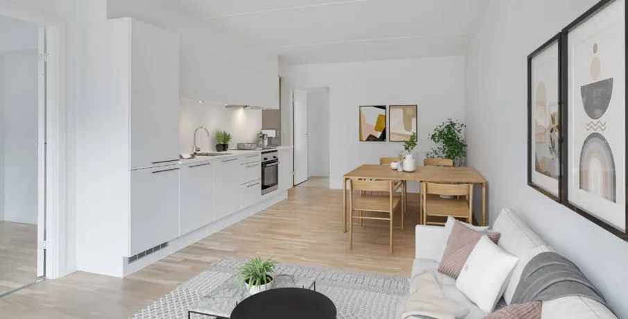 3-værelses lejlighed – Green Square Garden. Boligen. De 3-værelses lejligheder er ideelle til både par og mindre familier, der ønsker en moderne bolig med plads til samvær og ro. Planløsningen byder på to gode værelser, et lyst opholdsrum og et køkken i åben forbindelse, som gør rummet indbydende og socialt. Badeværelset er opført i lyse materialer, og flere boliger har egen altan eller terrasse.. Ejendommen. Green Square Garden tilbyder trygge rammer med grønne fællesarealer, elevator og gode adgangsforhold. Byggeriet er opført i moderne design og med fokus på komfort og kvalitet i hverdagen.. Området. Området omkring Green Square Garden byder på alt, hvad du behøver i dagligdagen – indkøb, spisesteder, fitness og grønne parker. Med metroen tæt på er der hurtig adgang til resten af København, mens Amager Strand kun er en kort cykeltur væk.. Billederne i denne annonce kan være fra lignende enheder og er kun til illustration. De repræsenterer stilen og kvaliteten af de tilgængelige enheder og kan variere i opbygning og detaljer.. Møblerne vist på billederne medfølger ikke. De skal give et indtryk af, hvordan rummet kan indrettes, men er ikke inkluderet i lejemålet..