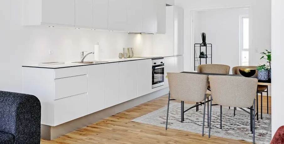 Velkommen til Nadinehus - Lys elegance i forskudte plan Nadinehus er tegnet som en integreret del af det moderne Bellakvarter i Ørestad. Den lyse bygning består af sammenhængende blokke der varierer let i højden for at give hele ejendommen liv og karakter, men de forskudte plan sikrer også optimale lysforhold i alle lejlighederne. Nadinehus omkranser et dejligt grønt gårdrum med afskærmede terrasser og en stor fælles plæne. Det private gårdanlæg kan nås gennem små passager og porte, der giver beboerne nem adgang til grøn afslapning. Når sollyset rammer Nadinehus lyse sten, bliver de reflekteret så hele bygningen lyser op og syner elegant og luksuriøs. Som en særlig detalje er alle altaner lakeret i en farve der matcher bygningens lyse tegl og understreger arkitekturens lethed. De 141 lejelejligheder findes i varierede størrelser for at matche behovet hos store og små familier, eller de som foretrækker singlelivet. Fælles for lejlighederne er det dejlige lys der strømmer ind ad de store, lyse vinduespartier, og tilbyder et fantastisk kig til omgivelserne. Alle lejligheder har en eller flere altaner, privat tagterrasse eller terrasse ved terræn. Den rummelige fornemmelse går igen i alle boliger, med en planløsning der giver åbenhed og kig på langs gennem de store rum. Materialevalget matcher den stringente arkitektur med lyse detaljer og naturlige gulve. Den travle børnefamilie kan samles i et moderne køkken-alrum med god plads til nærvær og hygge. Selv på badeværelserne får man et touch af luksus med rolige, indbydende farver der gør det let at indrette i en moderne stil. Nadinehus er en del af Ørestad; en bydel i byen, hvor alt er tænkt ind: indkøb, caféer, institutioner, rekreative områder og nem adgang til offentlig transport – alt sammen lige uden for døren. Her får du en bolig, der ikke blot er et hjem, men en del af et moderne kvarter med puls, fællesskab og masser af luft omkring dig. Aconto er fastsat ud fra forrige lejers forbrug. Der tages forbehold for fejl og evt. lejereguleringer. Der vil blive indhentet oplysninger hos RKI, og er man registeret hos RKI, vil man ikke kunne leje boligen. OBS: Der er 9 mdr. bindingsperiode og 3 mdr. opsigelse. Lejemålet er tidsubegrænset. Billeder er fra prøvebolig.