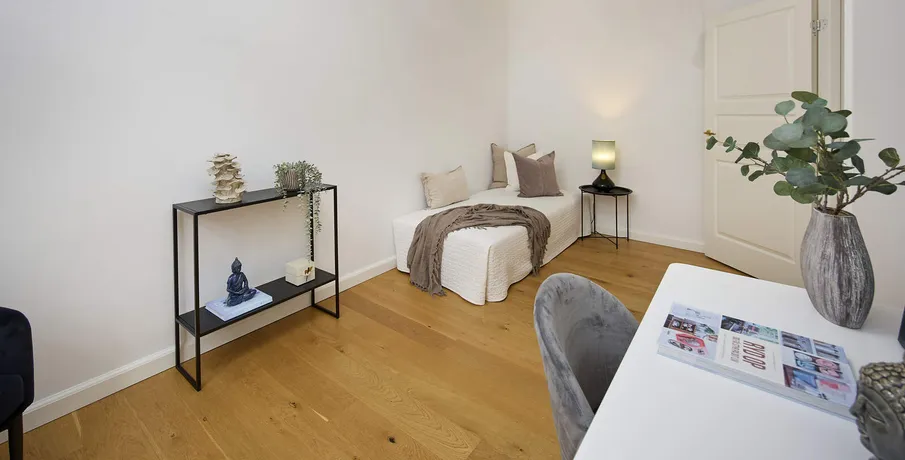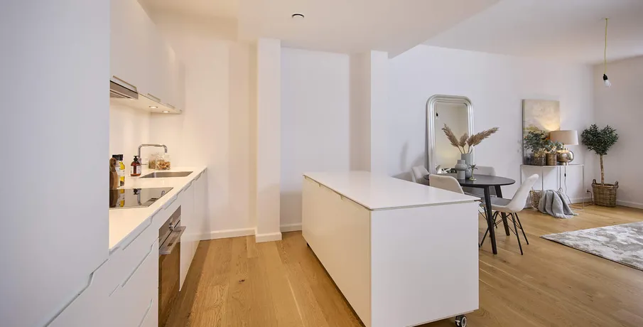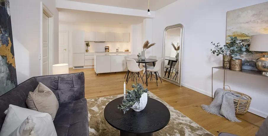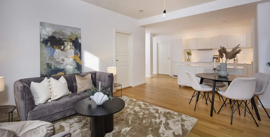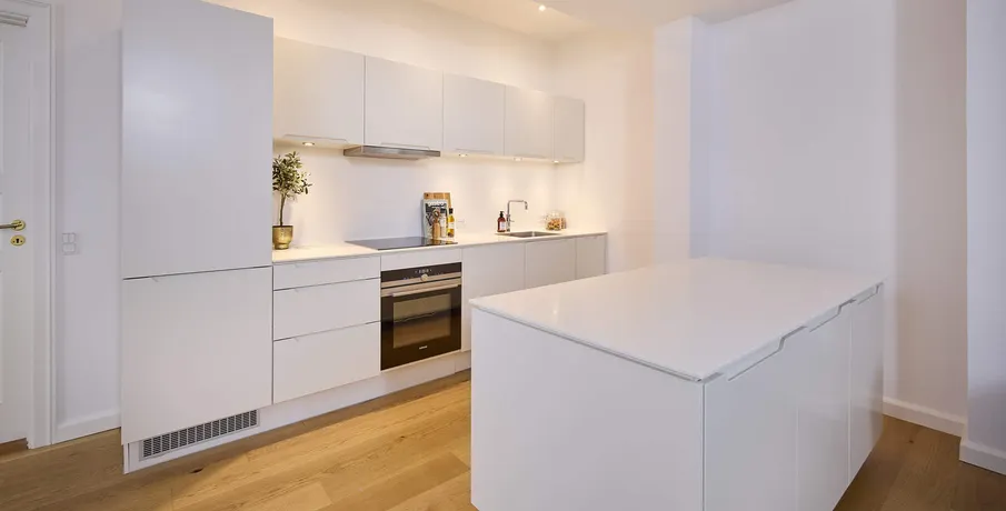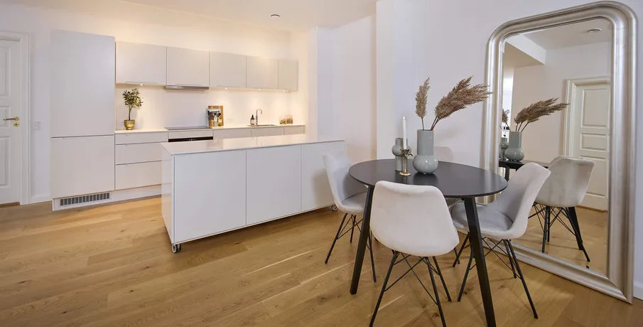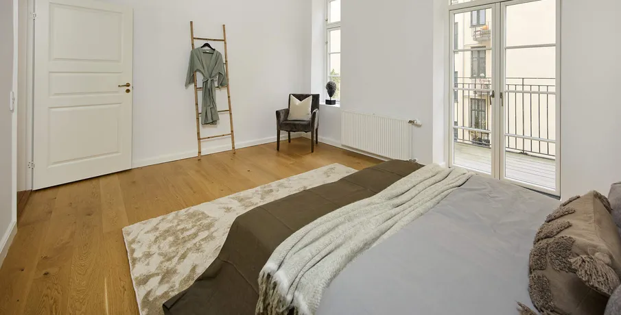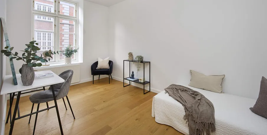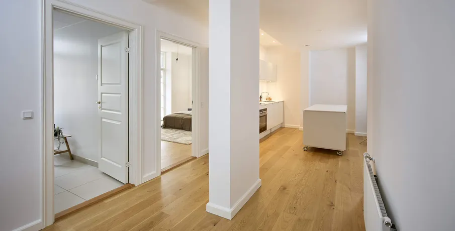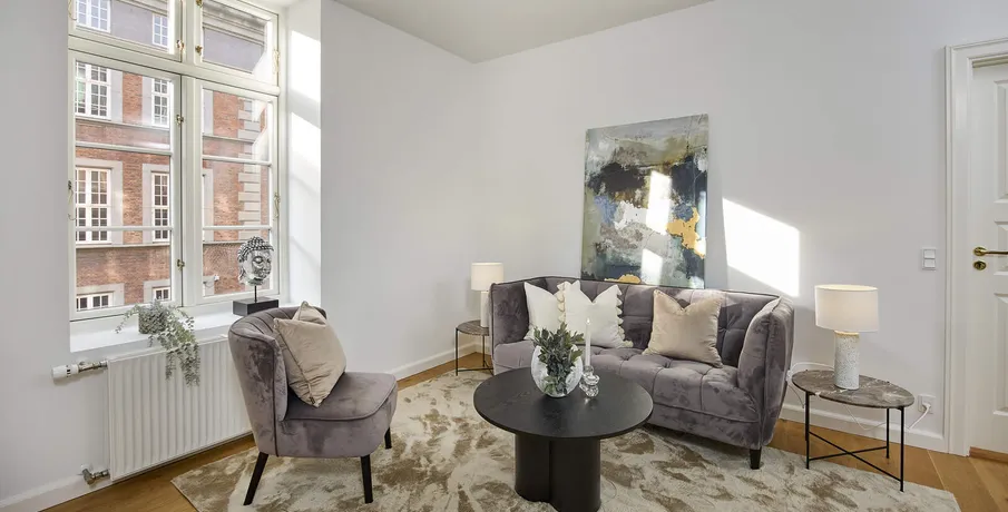 Om boligen. Ejendommen på Anker Heegaards Gade er en klassisk københavnerbygning opført i 1908, smukt placeret i det attraktive kvarter mellem Vesterbro og Indre By. Med sin historiske facade og renoverede opgange fremstår ejendommen både indbydende og tidløs.. Ejendommen rummer eksklusive liebhaverlejligheder, som er nænsomt renoveret med respekt for de oprindelige detaljer. Her finder man lejligheder med højt til loftet, lyse plankegulve i eg, store vinduespartier og moderne faciliteter som elevator og alt i hårde hvidevarer. Flere af lejlighederne har egen altan, og der er fokus på komfort og funktionalitet – blandt andet med rummelige badeværelser, vaskesøjle og åbne køkken-alrum med flytbar køkkenø og Quooker. Ejendommen er opvarmet med fjernvarme og har adgang til hurtige internetforbindelser. Der er ikke tilknyttet parkering, men beliggenheden gør det nemt at klare sig uden bil – med Hovedbanegården, metro og busser i gåafstand.. Ejendommen ligger i hjertet af København V – et attraktivt og levende område, hvor historisk charme møder moderne byliv. Området byder på et væld af caféer, restauranter og specialbutikker – ikke mindst i det nærliggende Kødbyen, som er kendt for sit pulserende natteliv og gastronomiske oplevelser. Tivoli, Rådhuspladsen og Strøget ligger også i gåafstand, hvilket gør beliggenheden ideel for dem, der ønsker at være tæt på både kultur, shopping og grønne områder som Ørstedsparken og Havnepromenaden.. Lejligheden indeholder: Indbydende entré, der leder videre til et flot renoveret køkken/alrum med alle hårde hvidevarer og god spiseplads. Køkken/alrummet er integreret med lejlighedens stue og skaber et åbent og indbydende opholdsrum. Lejligheden rummer to lyse og indretningsvenlige værelser med indbyggede skabe – det ene også med udgang til den skønne solrige altan med udsigt til gården. Badeværelset er flot renoveret med separat bruseniche og samt både vaskemaskine og tørretumbler.. Vi har anvendt henvisningsbilleder fra en identisk lejlighed på 2 sal i opgangen.