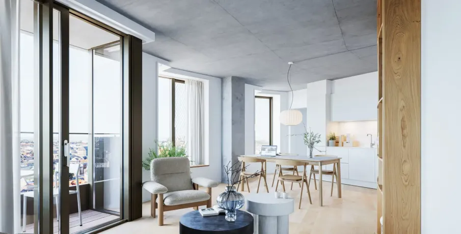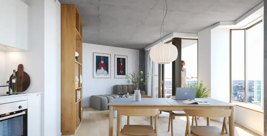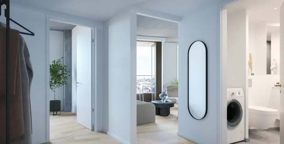 . Postbyens markante silhuet med sine fire runde tårne er allerede blevet et nyt vartegn for den centrale del af København. I to af tårnene indrettes der 160 moderne lejeboliger, som nu udbydes til udlejning med indflytning i februar 2026. Lejlighederne varierer i størrelse fra to til syv værelser og er alle udstyret med altan med udsigt til byens liv og Postbyens grønne oaser.. I Postbyen bor du i et helt nyt levende bykvarter med hoteller, butikker, restauranter, caféer, og meget mere. Dit nye hjem ligger omgivet af smuk arkitektur, og nedenfor din hoveddør ligger byparken, der grønt og frodigt snor sig gennem Postbyen.. Uanset om du lejer en 2-værelses eller en 7-værelses bolig i Postbyen, kommer du til at leve i et unikt og utraditionelt hjem, der byder på alt andet end kvadratiske rum. De cirkelrunde boligtårne skaber nemlig vinkler, snit og hjørner, hvor man hver dag kan glædes over at bo i et hjem, hvor vægge, gulve og lofter ikke følger den traditionelle vinkeltrekant.. Træd ind i et hjem, hvor æstetik og funktionalitet går hånd i hånd. Alle lejligheder i Postbyen er gennemtænkt ned til mindste detalje med materialer, der emmer af varme og elegance. De lyse lamelplankegulve i natureg med gulvvarme løber i et ubrudt flow gennem rummene og binder boligen harmonisk sammen.. Med lofter og søjler i beton opstår der en spændende og rå kontrast mellem det varme træ og den karakteristiske betonstruktur og tilfører boligen kant og karakter.. Køkkenalrummet har direkte adgang til altanen, hvor dagslyset strømmer ind.. Her møder strømlinet design fra Invita og corianbordplader de nyeste hårde hvidevarer i høj kvalitet. Det enkle design skaber en rolig og stilfuld ramme, hvor udsigten får lov at stjæle opmærksomheden.. Badeværelserne viderefører den enkle og eksklusive stil med smukke grå fliser, væghængte toiletter og en atmosfære af diskret luksus.. Som en gennemtænkt detalje er alle indvendige døre udført som indbyggede skydedøre, der både er pladsbesparende og giver et enkelt udtryk mellem rummenes indbyrdes forhold.. Øverst oppe i det lave boligtårn er der skabt rum for et imponerende fællesrum, hvor du som lejer kan booke dig ind til at afholde arrangementer, fødselsdage eller barnedåben.. Det er ligeledes muligt at leje parkeringsplads i kælderen.. Bemærk at billederne nødvendigvis ikke stammer fra den konkrete bolig, men kan være fra andre lejligheder i komplekset..