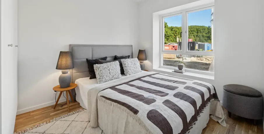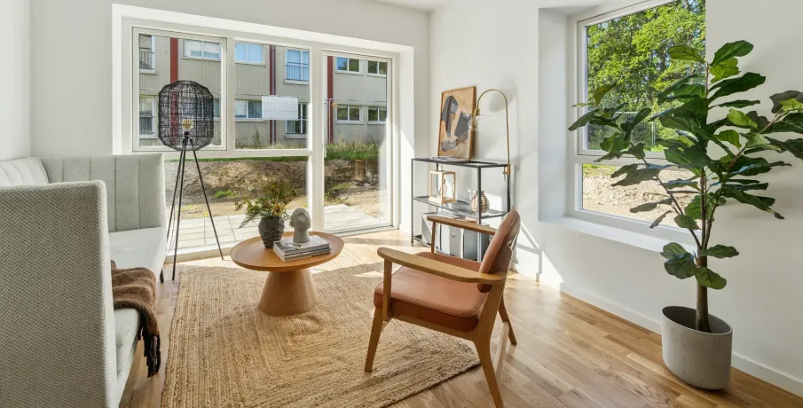 Om lejlighederne: Alle lejligheder er udstyret med altan eller terrasse og boligerne er indrettet i smagfulde materialer. Generelt er der lagt vægt på rummelige leverum indrettet med Invitakøkkener i moderne og stilrene designs, egetræsgulve og flot lysindfald fra de store vinduespartier. I alle lejligheder, er der etableret gulvvarme, herunder også i badeværelset, som er udstyret med energivenlig vaskemaskine og tørretumbler. I lejlighederne er der lagt vægt på gode opbevaringsløsninger i form af skabe og alle lejligheder har adgang til privat depotrum i boligen. De velindrettede boliger i Egekær er altså designet med fokus på funktionalitet og komfort, og de er ideelle til et liv uden de daglige bekymringer. Boligerne er indrettet, så de passer til alle livets faser og tilmed beliggende i rolige og naturrige omgivelser.
