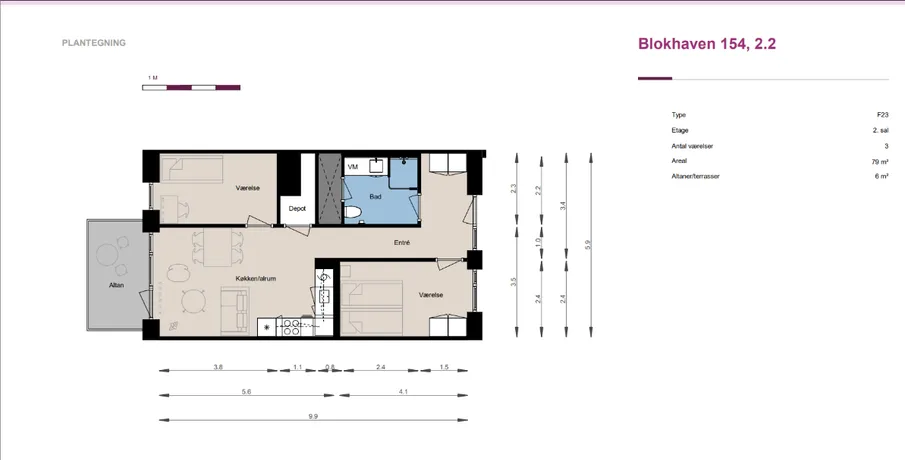 3 værelses lejlighed på 80 m2