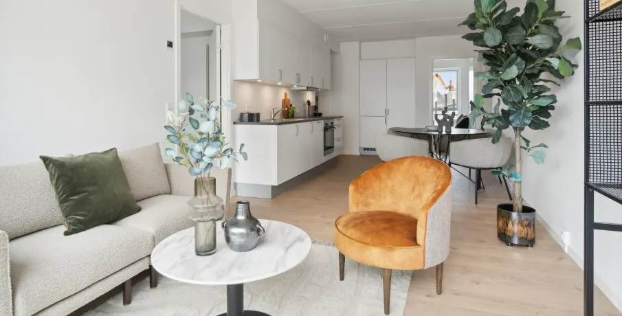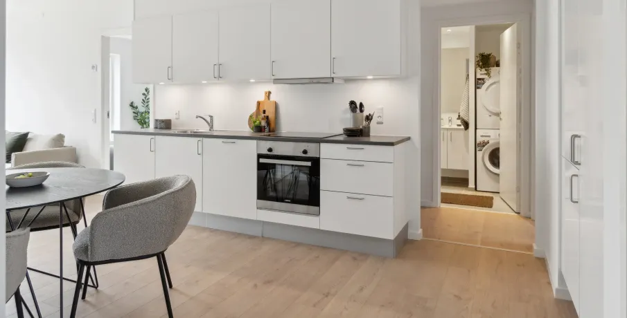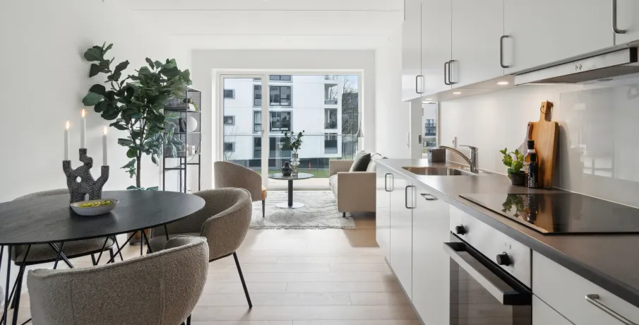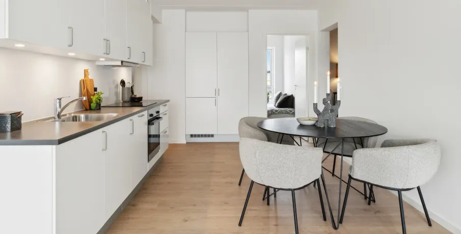 Augustas Haves boliger kommer med forskellige planløsninger. Du finder boliger fra 57 til 123 kvadratmeter fordelt på på 2-, 3-, 4- og 5-værelses lejligheder. Alle lejlighederne åbner sig op med større vinduespartier mod syd og er meget lysfyldte. Desuden har de en loftshøjde på mere end 2,6 meter, og derfor opleves boligerne som både rummelige, luftige og eksklusive.Boligerne er udført i lækre kvalitetsmaterialer og med komplet hårde hvidevarepakke fra Siemens. I køkkenet og på badeværelset får du hvide HTH elementer, som også går igen på værelserne, hvor du har faste skabe. Til alle boliger hører et depotrum samt et kælderrum til opbevaring af de ting, som ikke skal fylde i hverdagen.Langs sydfacadens åbne grønne espalier-væg har alle lejlighederne et lækkert udeområde – i form af en stor altan eller i form af en privat terrasse i stueetagen. Her er der enten udsigt eller direkte adgang til det store skønne, grønne parkområde, Amalieparken.Den gennemgående grønne linje skaber ikke blot et smukt miljø, men også funktionalitet og velvære. For eksempel er trælamellerne og den grønne beplantning på den sydlige facade med til at danne uderum og skabe naturlig solafskærmning på altaner og terrasser. Tæt om sommeren og let om vinteren.Der vil i forbindelse med anmodning om leje af boligen, blive fortaget en kreditvurdering af kommende lejer ved anvendelse af CPR-nummer. Det er ikke tilladt at være registreret i RKI, hvis man vil leje en bolig.OBS! Billederne er ikke fra den specifikke bolig.
