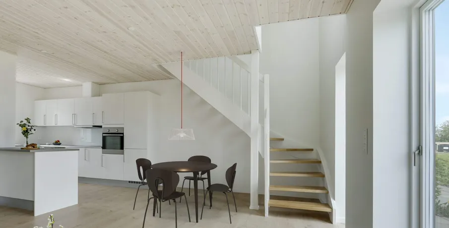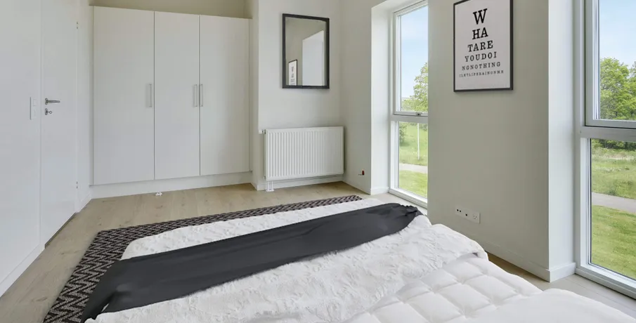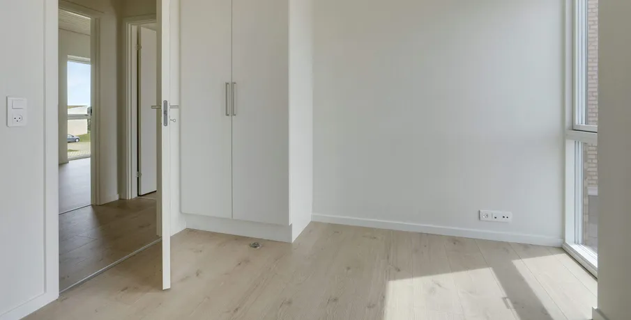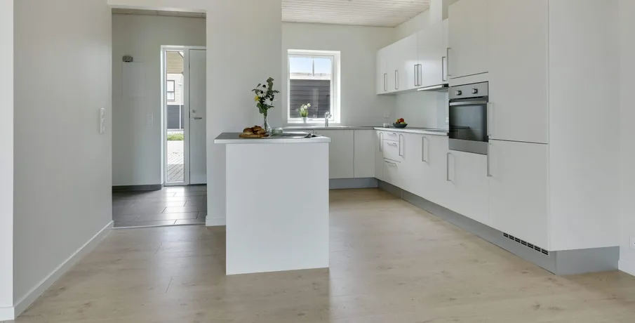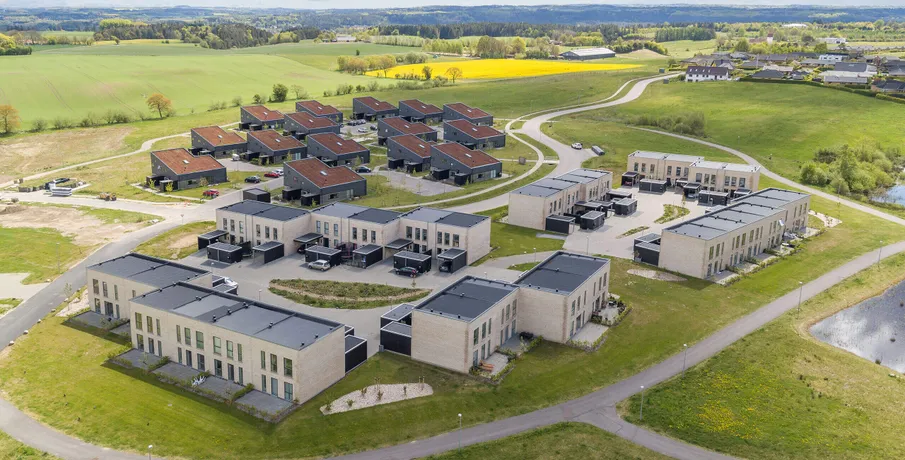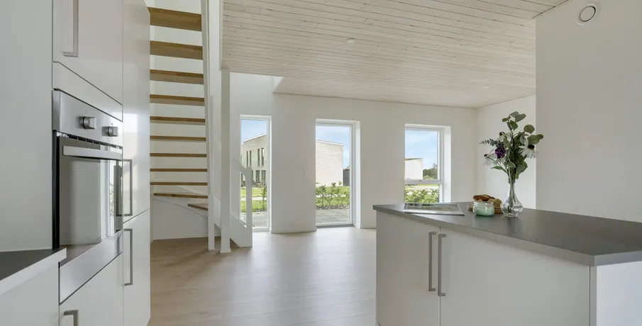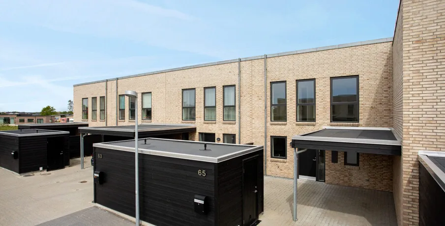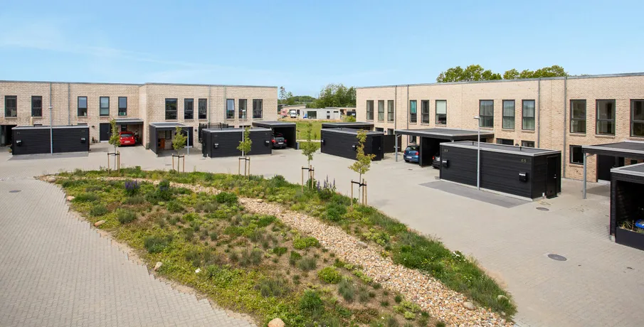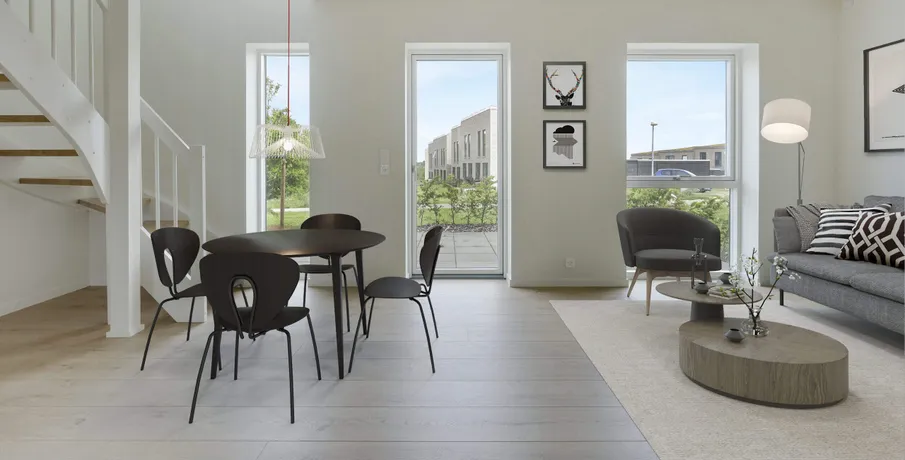 . 4 værelses rækkehus i skønne naturrige omgivelser – plads til hele familien. GØDVAD – ÅRETS LOKALOMRÅDE. Gødvad er en gammel landsby, som de seneste år har fået nyt liv som en integreret del af Silkeborg. Gødvad er i rivende udvikling og tiltrækker mange nye tilflyttere – og af god grund. I 2018 blev Gødvad kåret til årets lokalområde, bl.a. pga. sit aktive foreningsliv. I Gødvad er der daginstitutioner, to gode skoler og flere fritidsaktiviteter for børnene. Området er forbundet af trygge, oplyste stisystemer, og der er skøn natur med skov og kuperet terræn. Gødvad ligger desuden med nem adgang til Herningmotorvejen, som du når på ca. fem minutter. Derfra er du i Herning eller Aarhus på ca. en halv time.. TUSINDFRYD – RÆKKEHUSE I SKØN NATUR. Tusindfryd er et boligområde i Gødvad i det nordøstlige Silkeborg. Her er roligt og ingen gennemgående trafik, og boligområdet ligger naturskønt med udsigt over marker og grantræer. Trods den rolige beliggenhed er der ikke langt til dagligdagens fornødenheder. Fra Tusindfryd er der under 2 km til bl.a. Gødvadskolen, sportshallen og Rema 1000, som alt sammen kan nås via stisystem. Til Silkeborg Centrum er der ca. 6,5 km, og der er gode busforbindelser ind til byen.. Boligerne er lyst og tidløst indrettet med hvide vægge og lyse lofter. På badeværelserne og i bryggerset er der grålige klinker på gulvet. I de øvrige rum er der lyse laminatgulve med egetræslook. Der er faste hvide Svane-elementer i køkken, bad, bryggers og på værelserne, så boligen er lige til at flytte ind i. Gulvvarme i hele stueetagen sørger for stabil og behagelig varme. På 1. salens værelser giver radiatorer mulighed for en hurtig regulering af varmen.. På 1. salens badeværelse er der gulvvarme. Ventilationsanlæg sikrer et godt indeklima. Mindre depotrum under trappen til 1. sal. Til hvert hus er der en god carport. Desuden eget skur til praktisk opbevaring af fx cykler. Foran huset er der mulighed for at indrette en hyggelig gårdhave. Private terrasser på husets haveside er adskilt af hække.. *Husdyr tilladt efter aftale.. *Vand, varme og el afregnes direkte til forsyningsværkerne.