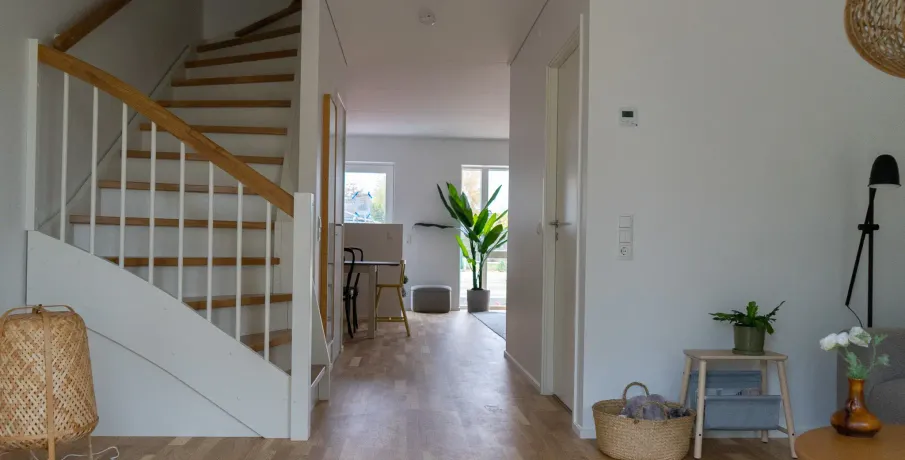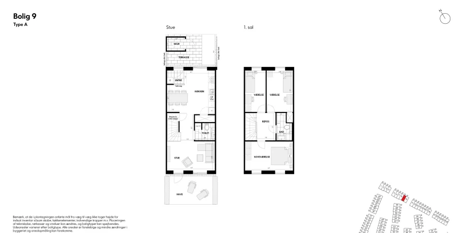 Familievenligt rækkehus med have mod sydvestVeldisponeret enderækkehus i 2 plan med parkering – og elladestandere – lige uden for døren. Fra indgangsterrassen foran huset træder du ind i vindfanget, som er direkte forbundet med boligens hjerte, køkken-alrummet. Stueetagen rummer desuden toilet og en hyggelig stue. Fra stuen er der udgang til haven, som med sin placering mod sydvest giver dig mange soltimer r, samtidig med at du er tæt på kvarterets store grønne fællesområde. På førstesalen finder du badeværelset, et stort soveværelse og to gode værelser med ekstra højt til loftet.Bemærk venligst, at de viste billeder er ikke fra/af den pågældende bolig, hvorfor udsigt, rum mv. kan variere. De viste billeder er derfor kun et eksempel, og den endelige størrelse og indretning kan variere (se plantegningen).