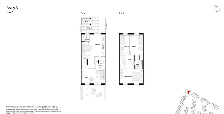 Familievenligt rækkehus med have mod sydvestVeldisponeret enderækkehus i 2 plan med parkering – og elladestandere – lige uden for døren. Fra indgangsterrassen foran huset træder du ind i vindfanget, som er direkte forbundet med boligens hjerte, køkken-alrummet. Stueetagen rummer desuden toilet og en hyggelig stue. Fra stuen er der udgang til haven, som med sin placering mod sydvest giver dig mange soltimer r, samtidig med at du er tæt på kvarterets store grønne fællesområde. På førstesalen finder du badeværelset, et stort soveværelse og to gode værelser med ekstra højt til loftet.Bemærk venligst, at de viste billeder er ikke fra/af den pågældende bolig, hvorfor udsigt, rum mv. kan variere. De viste billeder er derfor kun et eksempel, og den endelige størrelse og indretning kan variere (se plantegningen).