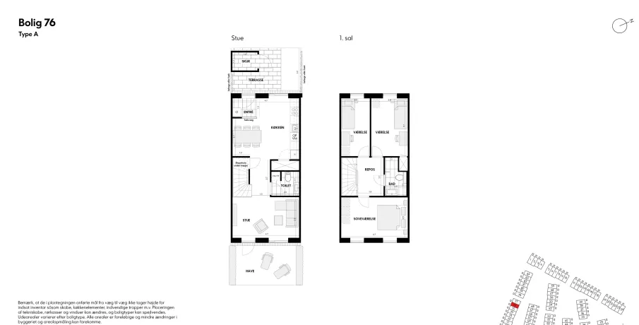 Familievenligt rækkehus med have mod sydvestVeldisponeret enderækkehus i 2 plan med parkering – og elladestandere – lige uden for døren. Fra indgangsterrassen foran huset træder du ind i vindfanget, som er direkte forbundet med boligens hjerte, køkken-alrummet. Stueetagen rummer desuden toilet og en hyggelig stue. Fra stuen er der udgang til haven, som med sin placering mod sydvest giver dig mange soltimer r, samtidig med at du er tæt på kvarterets store grønne fællesområde. På førstesalen finder du badeværelset, et stort soveværelse og to gode værelser med ekstra højt til loftet.Bemærk venligst, at de viste billeder er ikke fra/af den pågældende bolig, hvorfor udsigt, rum mv. kan variere. De viste billeder er derfor kun et eksempel, og den endelige størrelse og indretning kan variere (se plantegningen).