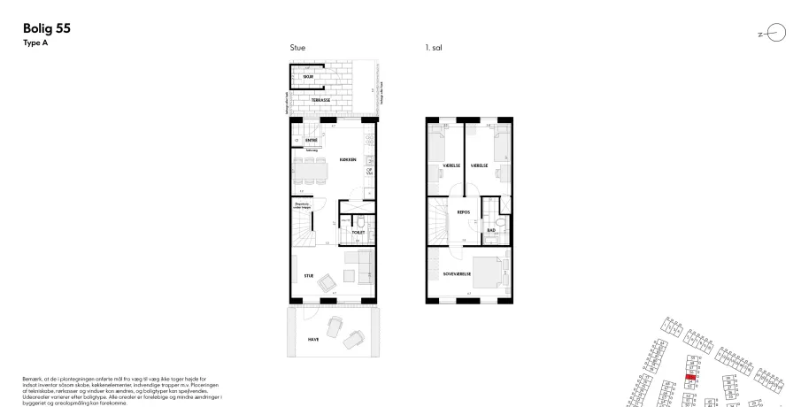 Familievenligt rækkehus med have mod sydvestVeldisponeret enderækkehus i 2 plan med parkering – og elladestandere – lige uden for døren. Fra indgangsterrassen foran huset træder du ind i vindfanget, som er direkte forbundet med boligens hjerte, køkken-alrummet. Stueetagen rummer desuden toilet og en hyggelig stue. Fra stuen er der udgang til haven, som med sin placering mod sydvest giver dig mange soltimer r, samtidig med at du er tæt på kvarterets store grønne fællesområde. På førstesalen finder du badeværelset, et stort soveværelse og to gode værelser med ekstra højt til loftet.Bemærk venligst, at de viste billeder er ikke fra/af den pågældende bolig, hvorfor udsigt, rum mv. kan variere. De viste billeder er derfor kun et eksempel, og den endelige størrelse og indretning kan variere (se plantegningen).