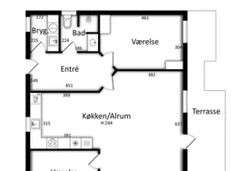 Med en placering midt i Søndersø ligger denne ejendom i et hyggeligt og charmerende boligområde, hvor både atmosfære og hverdag går op i en højere enhed. Her bor du centralt med under 300 meter til nærmeste indkøb, gode muligheder for offentlig transport og adgang til grønne områder, der skaber ro og liv omkring boligen. Det er en adresse, der gør det nemt at få hverdagen til at fungere – og samtidig føles hjemlig.. Lejemålet er i to plan og byder på en indbydende entré med både vaskemaskine og tørretumbler. Det store køkken-alrum har et flot lysindfald, og giver god plads til både madlavning og samvær. I køkkenet er der indsat en opvaskemaskine, sin din hverdag bliver lige lidt nemmere. Derudover rummer boligen et soveværelse, to værelser og et badeværelse med moderne udtryk.. Fra køkken-alrummet er der udgang til din egen terrasse, så du til enhver tid kan nyde et friskt pust i trygge og rolige rammer.. Praktisk info:. – Udover huslejen betales der til udlejer for vand. Dette beløb figurerer under a conto forbrug.. – El, varme og antenne opkræves direkte fra de pågældende forsyningsselskaber.. – Lejemålet opvarmes med fjernvarme.. – Disposition til kat.. Adgang til:. – Fælles parkering. – Skur