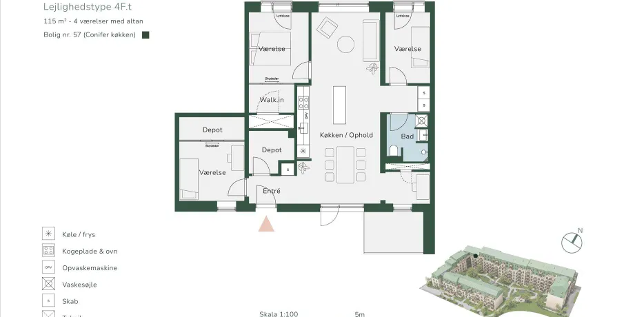 Nyopførte lejligheder i Virkelund i Coop Byen.Denne rummelige lejlighed på 115 m² byder på fire værelser, et køkken-alrum som giver direkte adgang til en skøn altan. Boligen har et moderne og funktionelt layout med walk-in closet, depotrum og vaskesøjle. I Gæstfriheden er der boliger til alle. Her kan enlige, par, familier og modne voksne finde deres hjem med perfekte private rammer kombineret med omgivelser, der indbyder til fællesskab. I første etape udbydes 61 boliger, der spænder mellem 2-værelses fra 60 kvadratmeter til 5-værelses taglejligheder på 137 kvadratmeter. Der er derfor rig mulighed for at finde lige netop dén bolig, der passer dig.I Gæstfriheden er æstetik og funktionalitet nøgleord. Boligerne er indrettet til en moderne livsstil med lyse rum, gode planløsninger og lækre detaljer. Blandt andet er boligerne indrettet med køkkener fra Stykka, der foruden produktion under bæredygtige hensyn, bringer farve ind i boligen.I Virkelund finder du boliger, som henvender sig til alle faser i livet – fra større familieorienterede boliger, til small living boliger for enlige og par samt boliger for modne voksne, der ønsker moderne rammer med nem ankomst og minimalt vedligehold.Samtlige boliger opføres under hensyn til miljøvenlige materialer og et sundt indeklima. Derudover har alle boliger egen altan eller terrasse, hvorfra den friske luft kan nydes omgivet af bykvarterets levende stemning.BEMÆRK billederne er fra en prøvebolig.