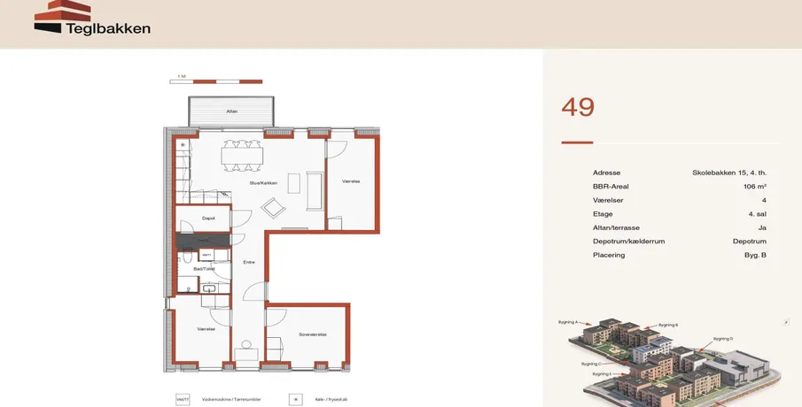 4-værelses lejlighed i Teglbakken i Hedehusene. Velkommen til Teglbakken, rummelige og moderne lejligheder ideelle til familier, der ønsker at bo i det populære område Nærheden i Hedehusene.. De 4-værelses lejligheder har moderne køkken med hårde hvidevarer, vaskemaskine og flere med tørretumbler. Planløsningen giver god plads til familieliv og samvær, og flere boliger har altan.. Ejendommen. Teglbakken er et moderne byggeri med elevator, cykelparkering og grønne fællesområder. Her får du en tryg og behagelig hverdag i et aktivt og levende nærmiljø.. Området. Beliggenheden i Nærheden giver kort afstand til Hedehusene Station, hvor lyntoget kører til København på cirka 19 minutter. Området byder på grønne parker, stisystemer, gode indkøbsmuligheder og flere skoler, herunder Læringshuset, som er kendt for sit moderne læringsmiljø.. Et rummeligt og moderne hjem i hjertet af Nærheden.. Billederne i denne annonce kan være fra lignende enheder og er kun til illustration. De repræsenterer stilen og kvaliteten af de tilgængelige enheder og kan variere i opbygning og detaljer.. Møblerne vist på billederne medfølger ikke. De skal give et indtryk af, hvordan rummet kan indrettes, men er ikke inkluderet i lejemålet..