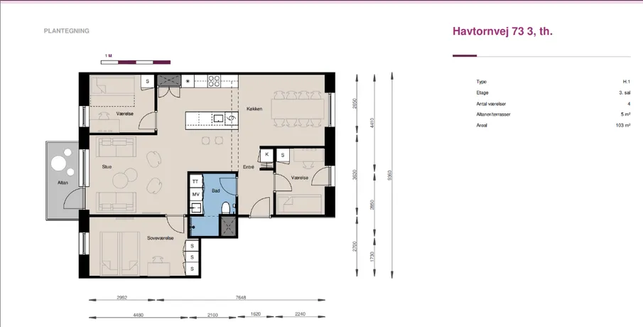 4 værelses lejlighed på 103 m2